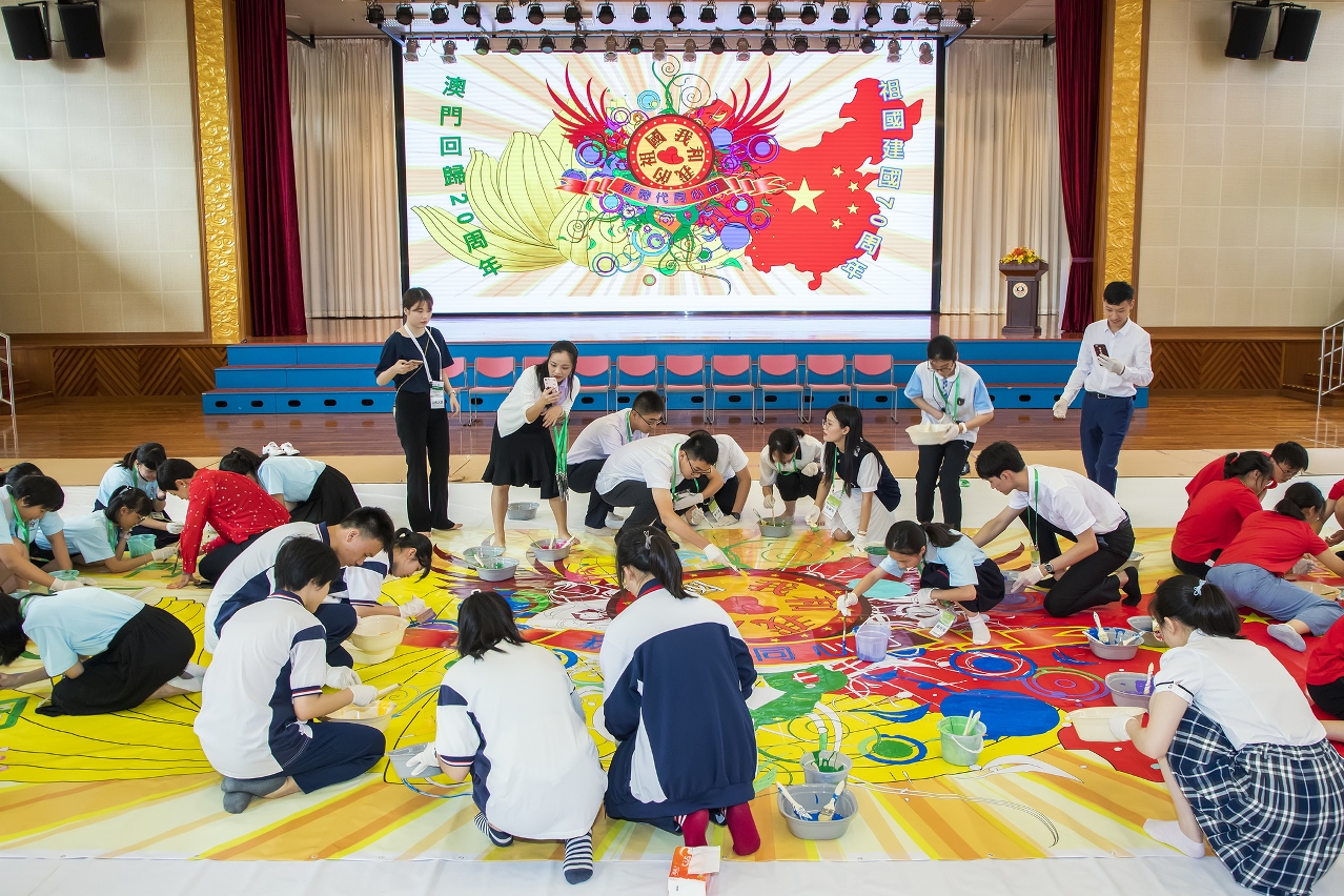 兩地學生還一起合作繪製一幅8米長4米寬的大型畫幅,寓意澳門回歸祖國20周年及新中國建國70周年的美好祝願,最後兩地師生與畫幅合影留念。交流活動圓滿結束,兩地學生共同渡過一個美好的上午,彼此建立友誼,留下美好的回憶。