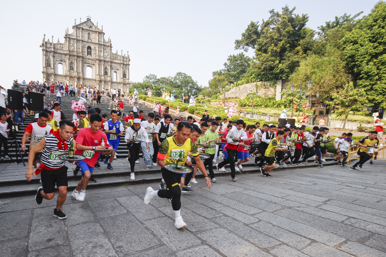 傳統托盤比賽在同日下午舉行,雲集接近180名參賽者,分別代表澳門逾29間酒店及餐廳等,適逢今年為澳門特別行政區成立二十周年,參賽者在出發前於大三巴牌坊排成數字“20”大合照,為活動增添喜悅。亦有參賽者穿上配合回歸主題的特色服飾。各參賽者手持承載一瓶“澳門啤酒”的托盤穿越“澳門歷史城區”街道,以最快速度將啤酒安全送到終點議事亭前地,過程緊張刺激,沿途吸引大批旅客駐足拍照甚至替參賽者打氣,展現澳門的旅遊魅力。男子組冠軍由澳門金沙城中心的Warren Obejas Cabada奪得;女子組冠軍是佳景集團的葉小淨;最特別服裝獎得主分別是佳景集團的歐歡明和金龍酒店的崔智弘。