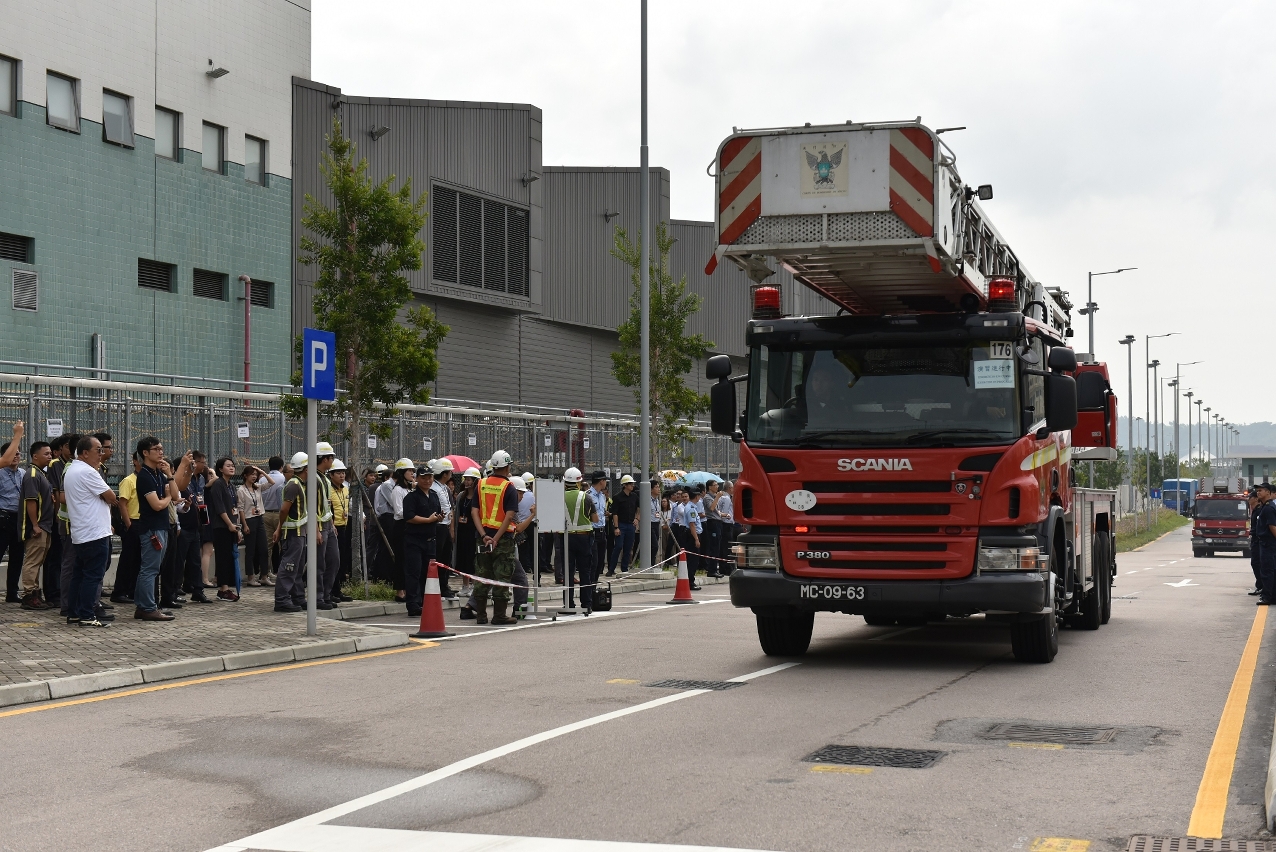 演習模擬輕軌車廠維修區內有一輛電池機車冒出濃煙而觸發火警警報系統,車廠保安中心致電消防局求助,同時啟動緊急疏散程序。期間保安人員嘗試撲滅火警,本局接報後隨即按相關預案派出緊急車輛及人員到達現場,並向車廠保安人員瞭解情況,隨即展開滅火救援工作。