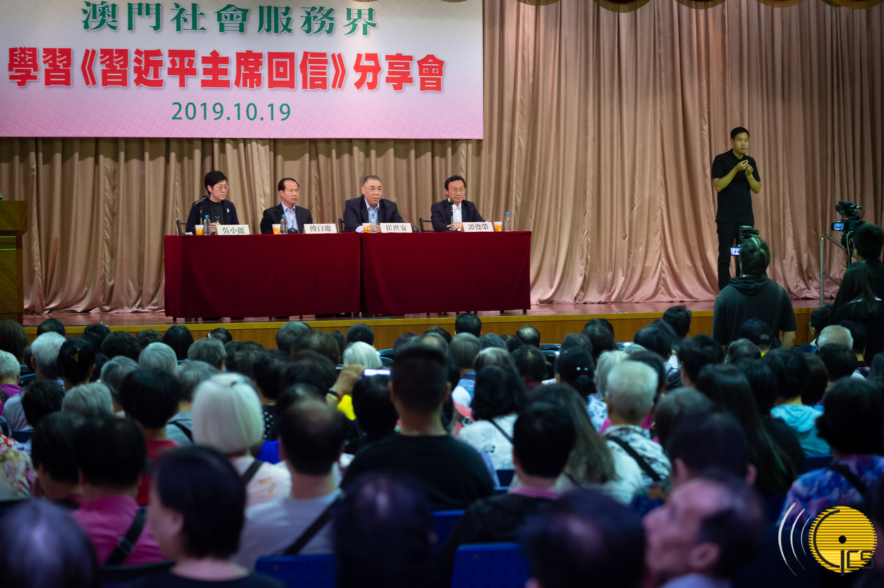 分享會上午在鏡湖醫院大禮堂舉行,行政長官崔世安、中央政府駐澳門聯絡辦公室主任傅自應及社會文化司司長譚俊榮,先後就習主席回信發表感想,多個社會服務團體的代表亦有發言。