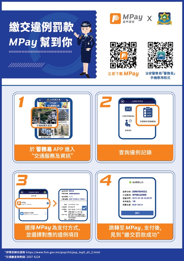 治安警察局持續優化收納交通違例罰款服務,在「警務易」手機應用程式已新增使用「MPay澳門錢包」繳納罰款的功能,進一步提高便民程度。新版本的「警務易」應用程式已於iOS及Android系統推出,巿民在更新應用程式後即可使用新功能。