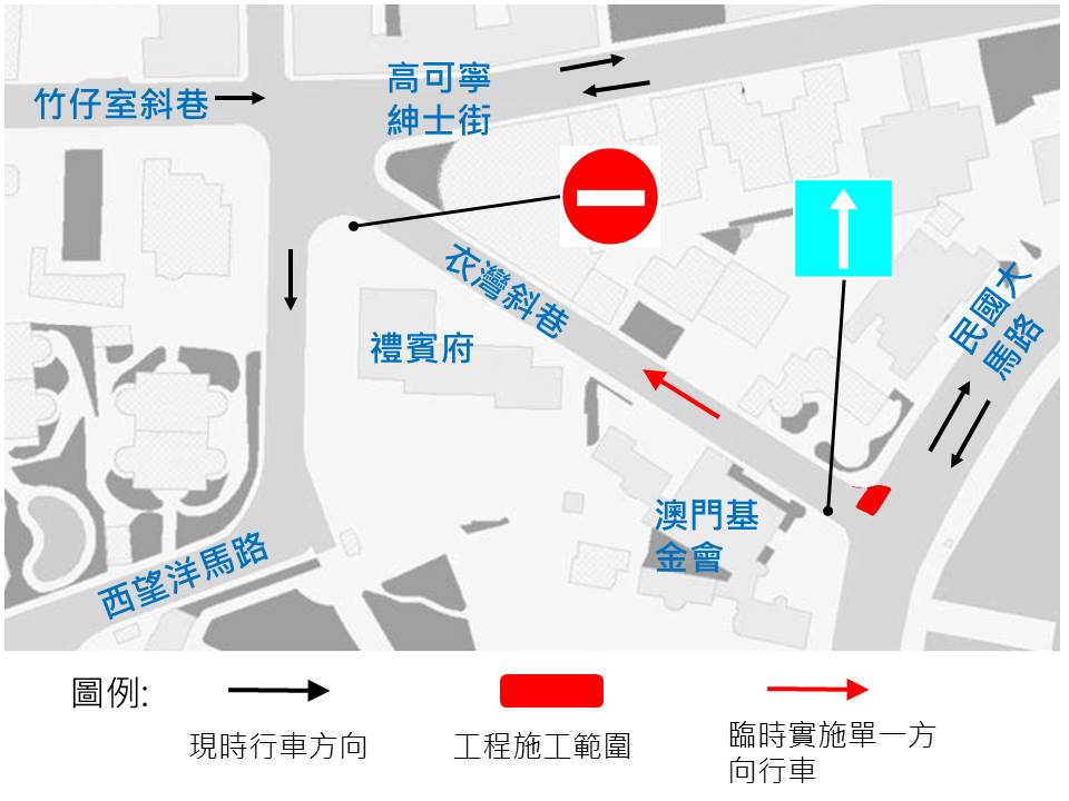 交通事務局進行管道鋪設工程,11月5日(周二)至13日(周三),近禮賓府的衣灣斜巷臨時改作單一方向行車,即車輛只能由民國大馬路往高可寧紳士街方向行駛。期間,9及16路線巴士改道行駛,臨時不停靠“西坑街"站及“濠璟酒店"站,乘客可改於“風順堂街"站、“亞婆井前地"站及民國馬路臨時站搭乘有關路線,請公眾留意。