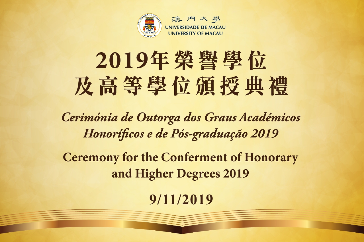 澳門大學榮譽學位及高等學位頒授典禮將於11月9日(星期六)下午4時在澳大大學會堂舉行,向喬曉陽、劉羨冰、盧煜明和鍾志平頒授澳大榮譽博士學位,以表彰其卓越成就及為社會發展和教育做出重大貢獻。此外,同場還會頒授博士及碩士學位。