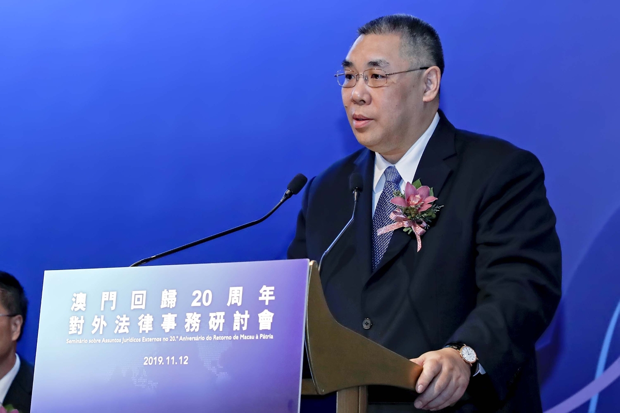 他進一步指,對外法律事務是澳門特區對外事務的重要一環;當前,在中央政府的大力支持和幫助下,澳門加入的國際組織從50多個增至100多個,參加的國際公約從150多個增至600多個,給予《澳門特區護照》免簽證或落地簽證待遇的國家和地區從3個增至140多個,以“中國澳門”名義簽署的國際協議分佈在經濟、貿易、金融、司法協助、民航等領域。