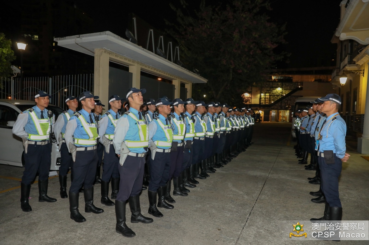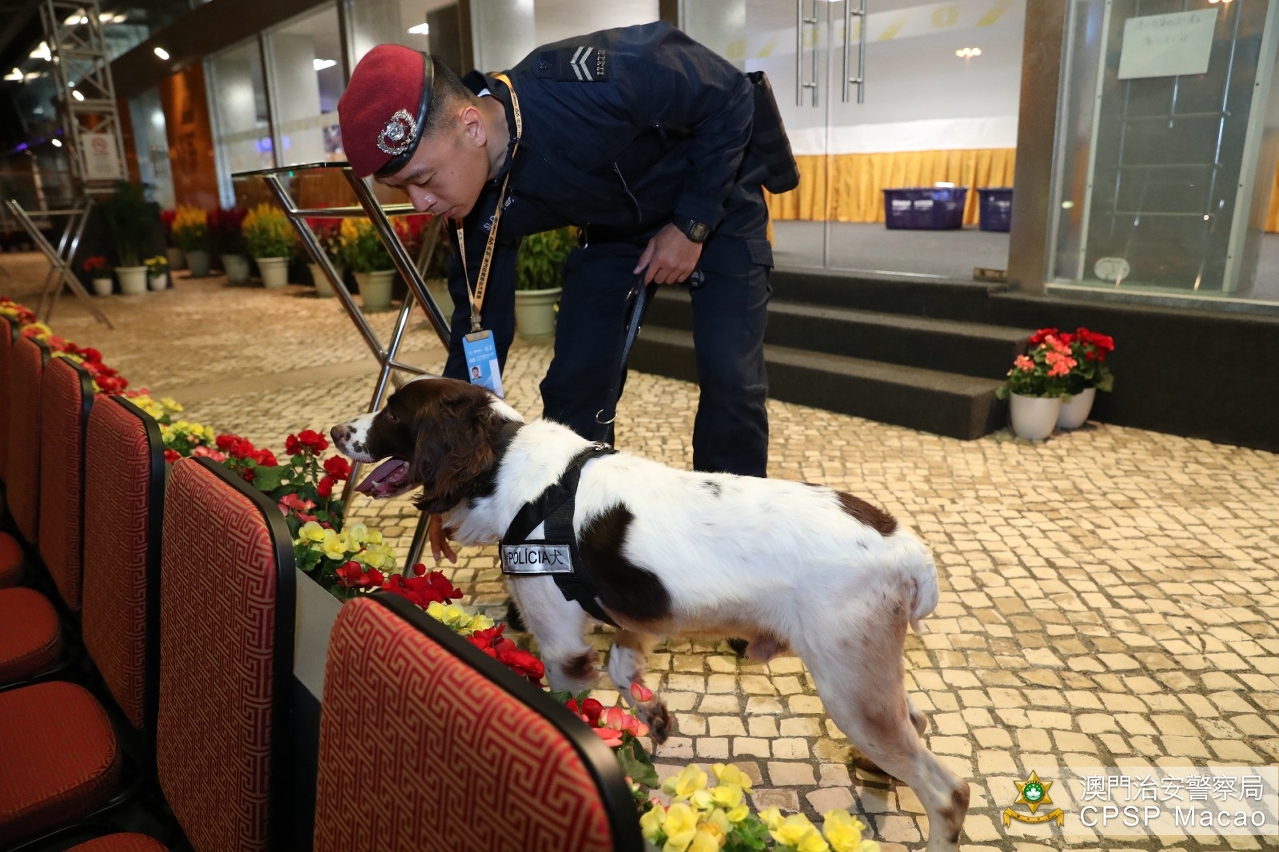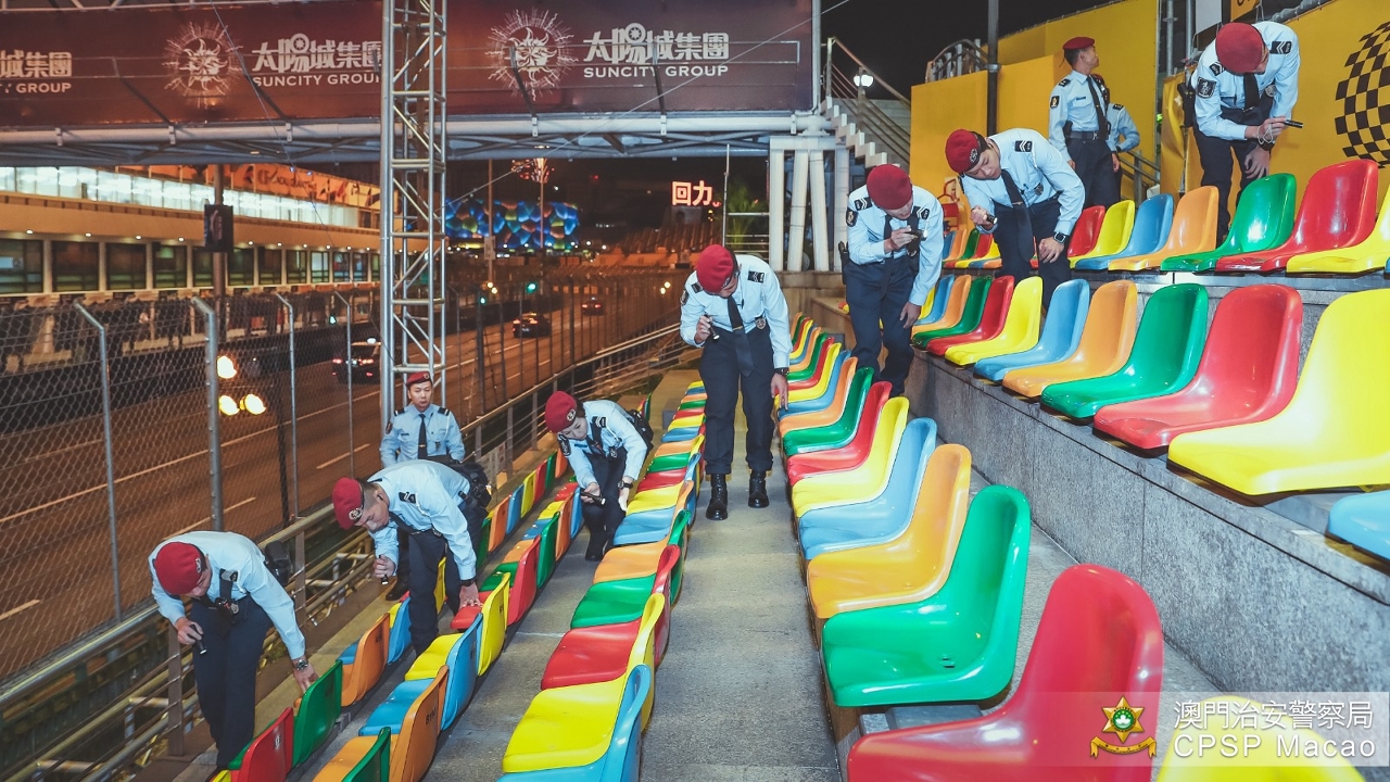 「第66屆澳門格蘭披治大賽車」於今(14)日起進行賽事,治安警察局全力做好各項安保及賽道周邊疏導車流工作,確保賽事順利進行及巿面交通秩序。警務指揮官趙崇遠警務總長於今早與所有參與大賽車安保工作的警務人員進行列隊,其後特警隊攜同警犬前往賽道及看台進行安全巡查及搜查可疑物品,確保賽道及周邊的安全。