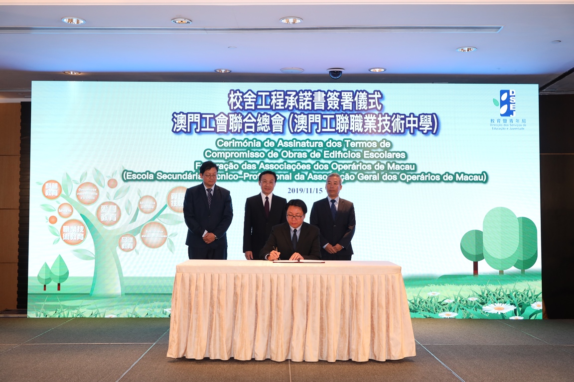 非高等教育委員會和青年事務委員會於2019年11月15日上午在旅遊塔舉行聯合座談會。會議前,首先舉行了簽署儀式,在社會文化司司長譚俊榮的見證下,教育暨青年局局長老柏生與7個辦學實體的代表進行了改善學校教育環境各項工作簽署儀式及校舍工程承諾書簽署儀式。包括與聖安東尼教育會簽署了加入免費教育學校系統承諾書及“藍天工程”計劃意向書,與澳門德明學校教育協進會簽署了“藍天工程”計劃意向書,與天主教澳門教區、澳門工會聯合總會及澳門葡文學校基金會簽署了教育用地使用意向書,與澳門工會聯合總會、教業中學教育協進會、鮑思高慈幼會簽署了校舍工程承諾書。出席簽署儀式的,還有各個辦學實體代表、學校代表、非高等教育委員會委員、青年事務委員會委員,以及教育發展基金行政管理委員會成員。