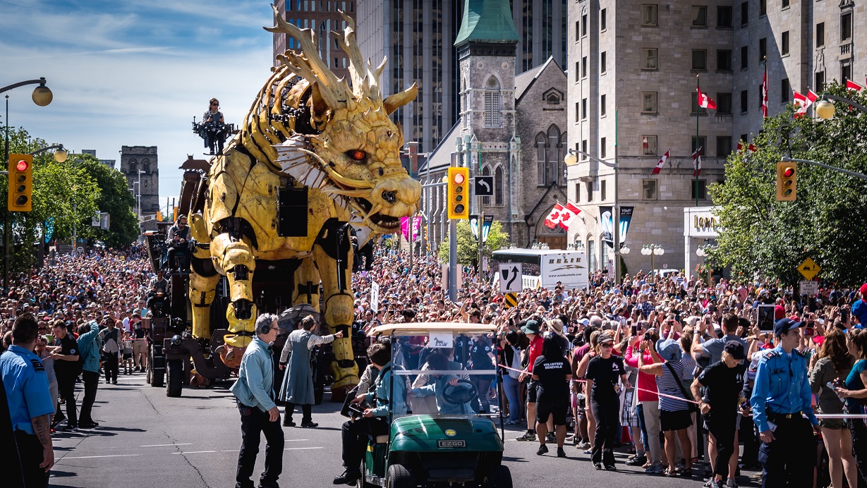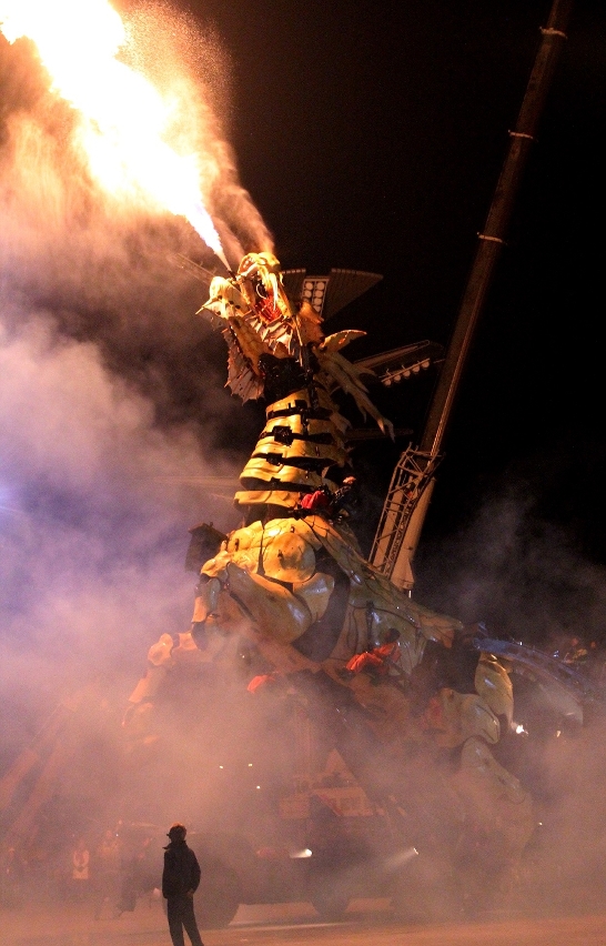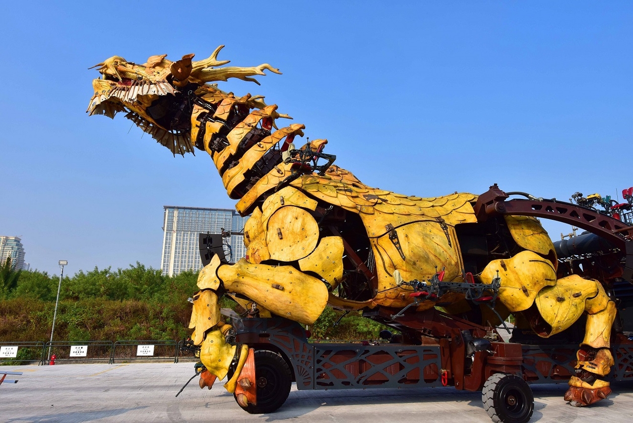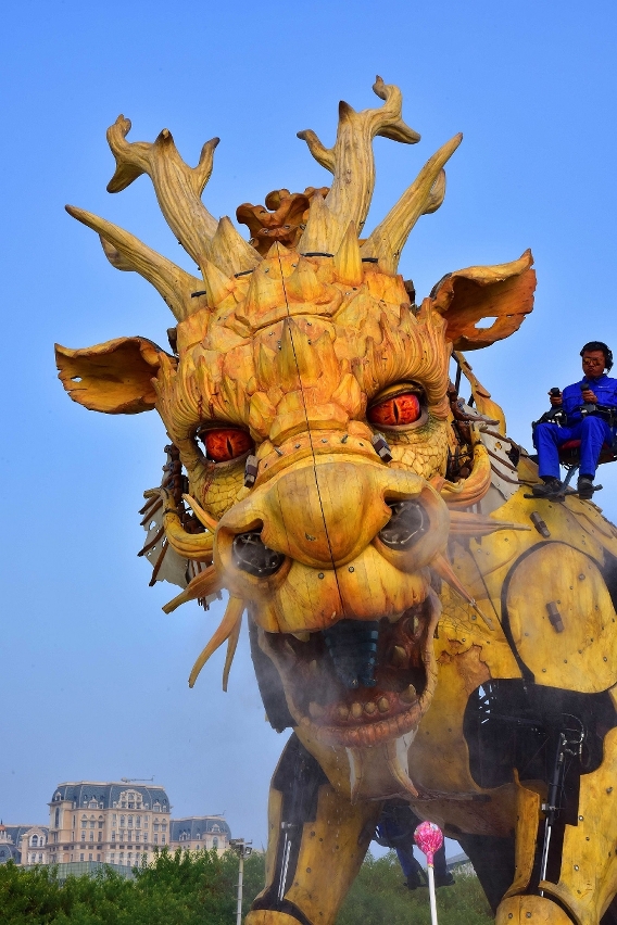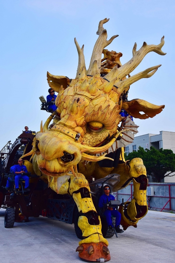 由中國及法國團隊精心製作的大型機械裝置“龍馬精神”,以特殊木材製成,通體呈黃色,心臟是一個由熱電混合的動力引擎,配件繁多,構造複雜,表演過程中需要15人控制操作,其規模、重量、藝術創造、工藝和技術是目前世界之最;內置機械結構、液壓傳動、電子感應控制系統等多種裝置,造型獨特,可以做出奔跑、騰躍、屈腿及後退,也能眨眼、轉動脖子、轉動耳朵、擺尾,更能做出噴火與吐霧等動作,形象栩栩如生,威武澎湃,還會與現場觀眾互動。