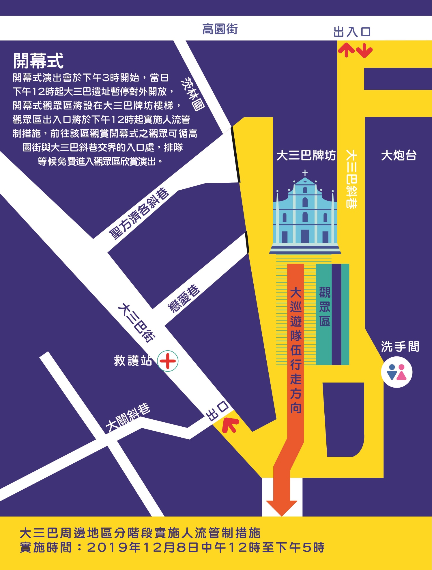 大巡遊開幕式將於12月8日下午3時在大三巴牌坊舉行,巡遊隊伍出發後將途經大三巴街、賣草地街、板樟堂街、板樟堂前地、議事亭前地、羅結地巷、大堂街、大堂斜巷、南灣大馬路、區華利前地、南灣湖景大馬路、何鴻燊博士大馬路,最後到達西灣湖廣場上演回歸慶典,至晚上7時結束。