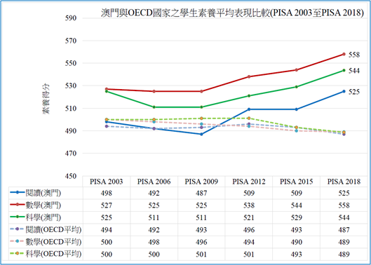 澳門15歲學生在PISA 2018三項素養的平均表現均顯著優於OECD國家的平均水平,得分僅次於中國(北京-上海-江蘇-浙江)四省市和新加坡,世界排名第三,其中閱讀素養得分525,數學素養得分558,科學素養得分544分。