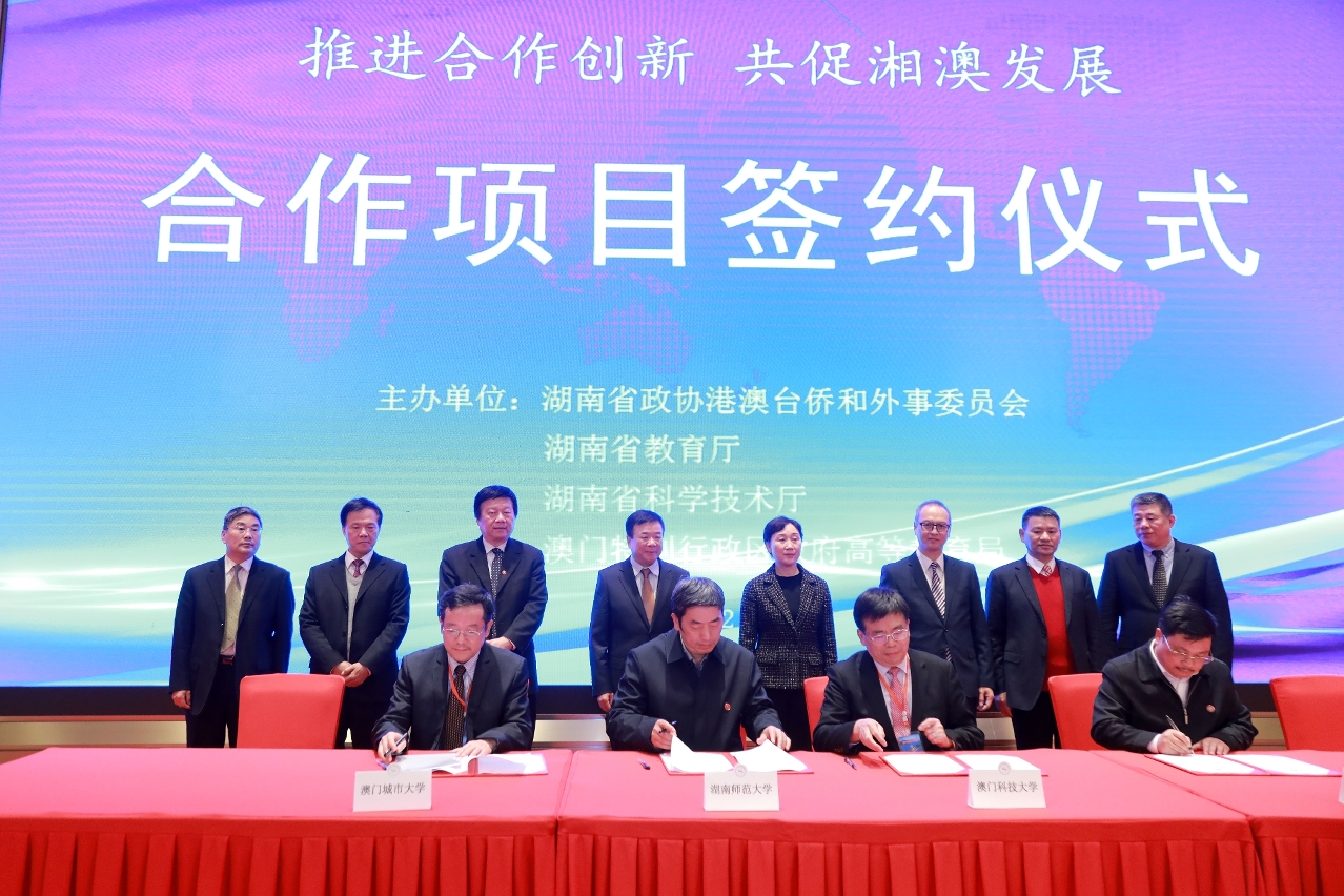 其後,舉行湘澳科教合作專案簽訂儀式。澳門科技大學劉良校長、澳門大學葛偉副校長、澳門鏡湖護理學院尹一橋院長分別與湖南中醫藥大學簽署合作協議,推進教育、科研、師生交流等方面合作;澳門城市大學張曙光校長、聖若瑟大學薛沛德校長(Peter Stilwell)分別與湖南師範大學簽署合作協議,加強學術交流、師生互訪、科研合作等方面。