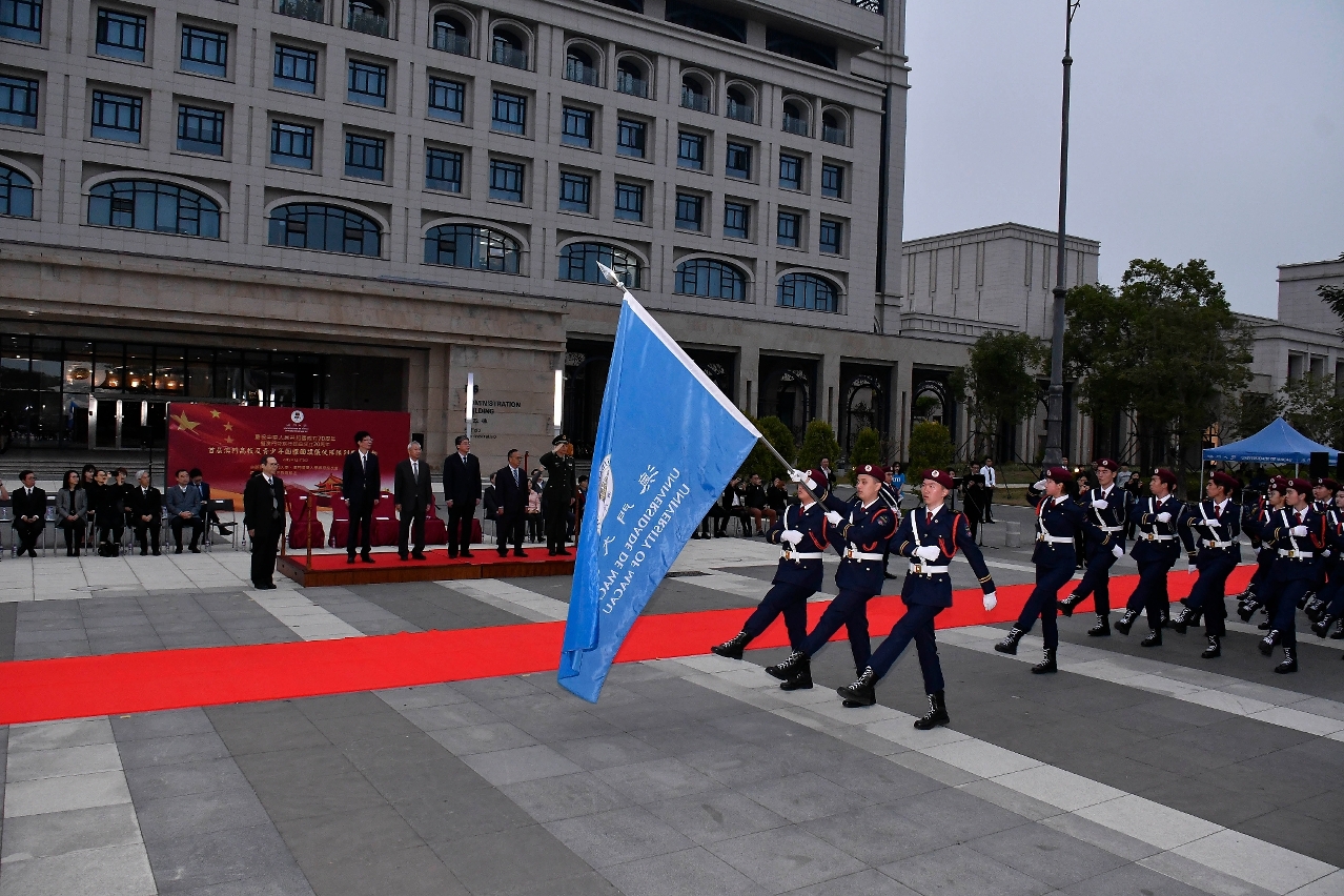 中聯辦副主任羅永綱、外交部駐澳門特別行政區特派員公署代表鄭新友、駐澳部隊代表竇國杰大校、澳大校董會主席林金城和澳大校長宋永華檢閱隊伍。澳門大學附屬應用學校國旗隊、澳門學界升旗隊、澳門童軍總會儀仗隊、治安警少年團、澳門保安部隊高等學校、澳門旅遊學院國旗隊、澳門理工學院國旗儀仗隊、澳門城市大學學生國旗隊、澳門科技大學儀仗隊和澳門大學國旗儀仗隊在行進時以獨特的步法展示訓練的成效。