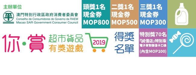 消費者委員會舉辦「你•賞超市貨品 - 2019」 有獎遊戲的得獎名單已上載到消委會網頁(www.consumer.gov.mo),歡迎瀏覽。得獎者可於2020年1月9日或之前攜同澳門居民身份證正本及遊戲抽獎券,親臨高士德大馬路26號何鴻燊夫人大廈4樓消委會辦事處領獎。