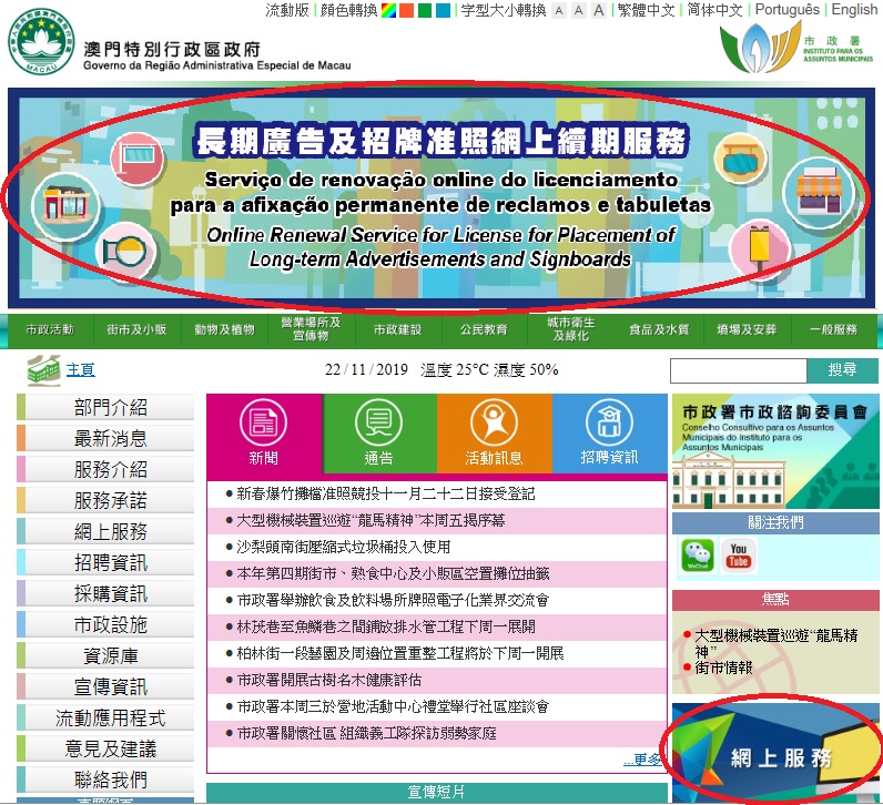 市政署秉持以民為本的精神,持續優化廣告准照之行政手續,今年正式推出“長期廣告及招牌准照-網上續期”服務,方便持牌人透過網上系統續期,不受辦公時間限制且無須親臨服務中心,並可自行列印相關之續期准照。