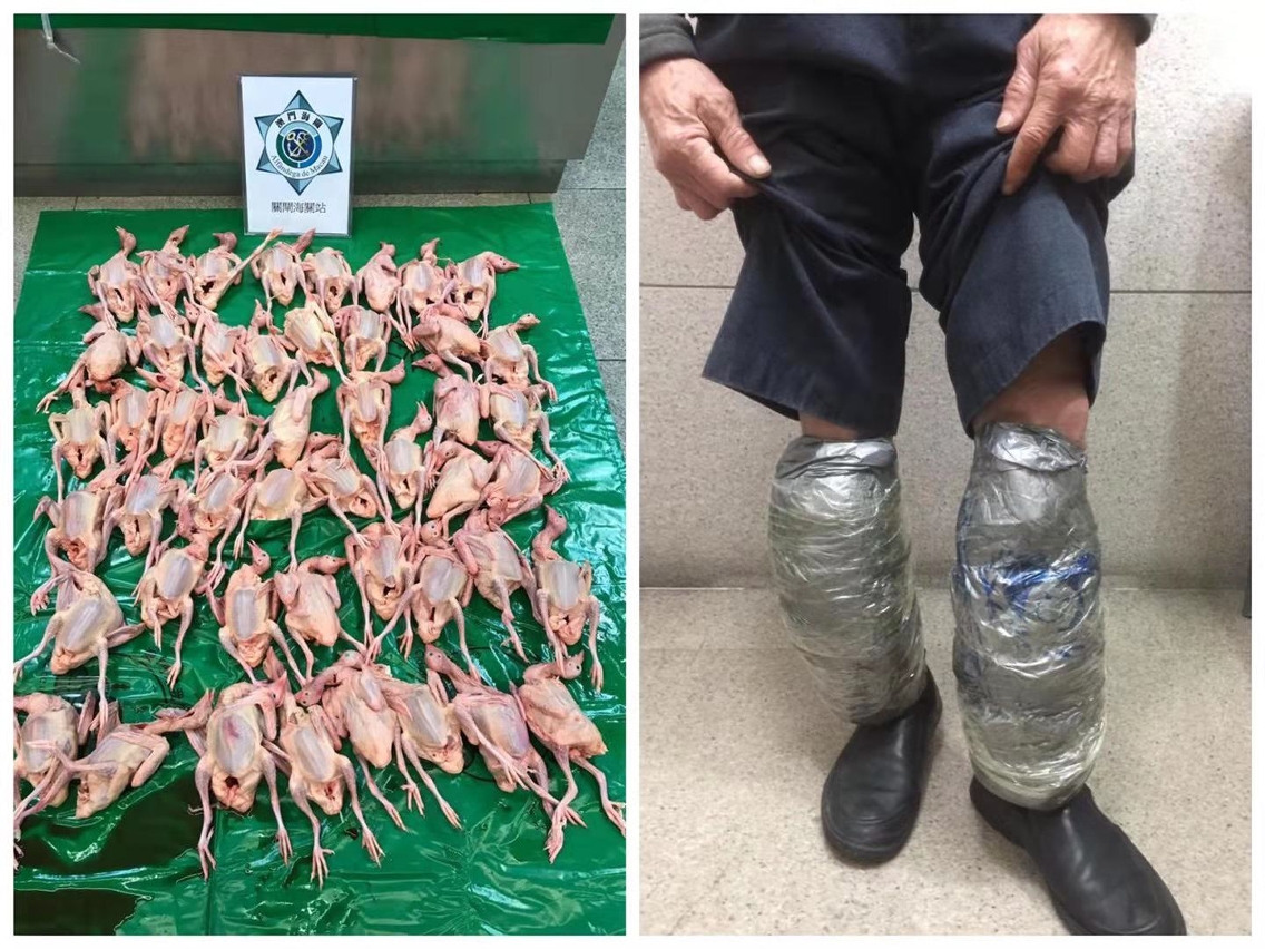 海關持續打擊“水客”活動,以防止未經檢疫的食品流入本澳,海關於2月1日在關閘口岸進行突擊行動期間,截獲一名由內地返澳的本地男子,關員首先於其手提袋內發現藏有一批已宰乳鴿,再作詳細搜查時發現其小腿亦綁纏了大量已宰乳鴿,總數合共約重18公斤。由於上述食材未經衛生檢疫及該名男子未能提供任何進口所須申報文件,海關已根據《對外貿易法》之相關規定,對其作出起訴,一經判罰,可被科處澳門幣5千元至10萬元罰款,而被查獲的貨物亦歸澳門特別行政區所有。