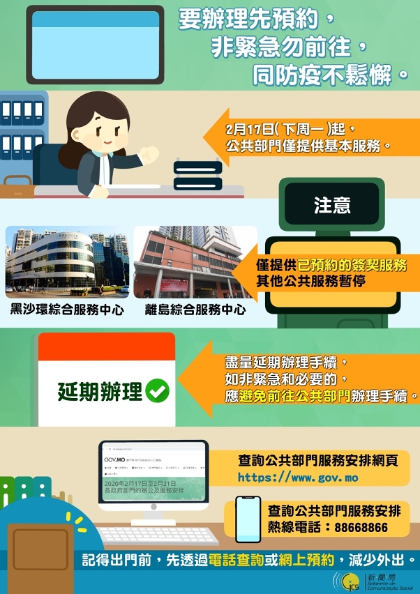 公共部門下周一起恢復辦公,僅提供基本服務;然而,為免人群聚集,增加病毒傳播風險,市民有意到公共部門辦理手續之前,就請先看看這個圖文包的內容。必讀!