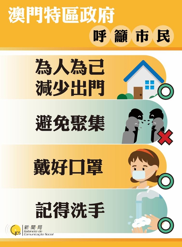 政府調整在公共地方播放的宣傳口號-「特區政府呼籲:為人為己,減少出門,避免聚集,戴好口罩,記得洗手。」