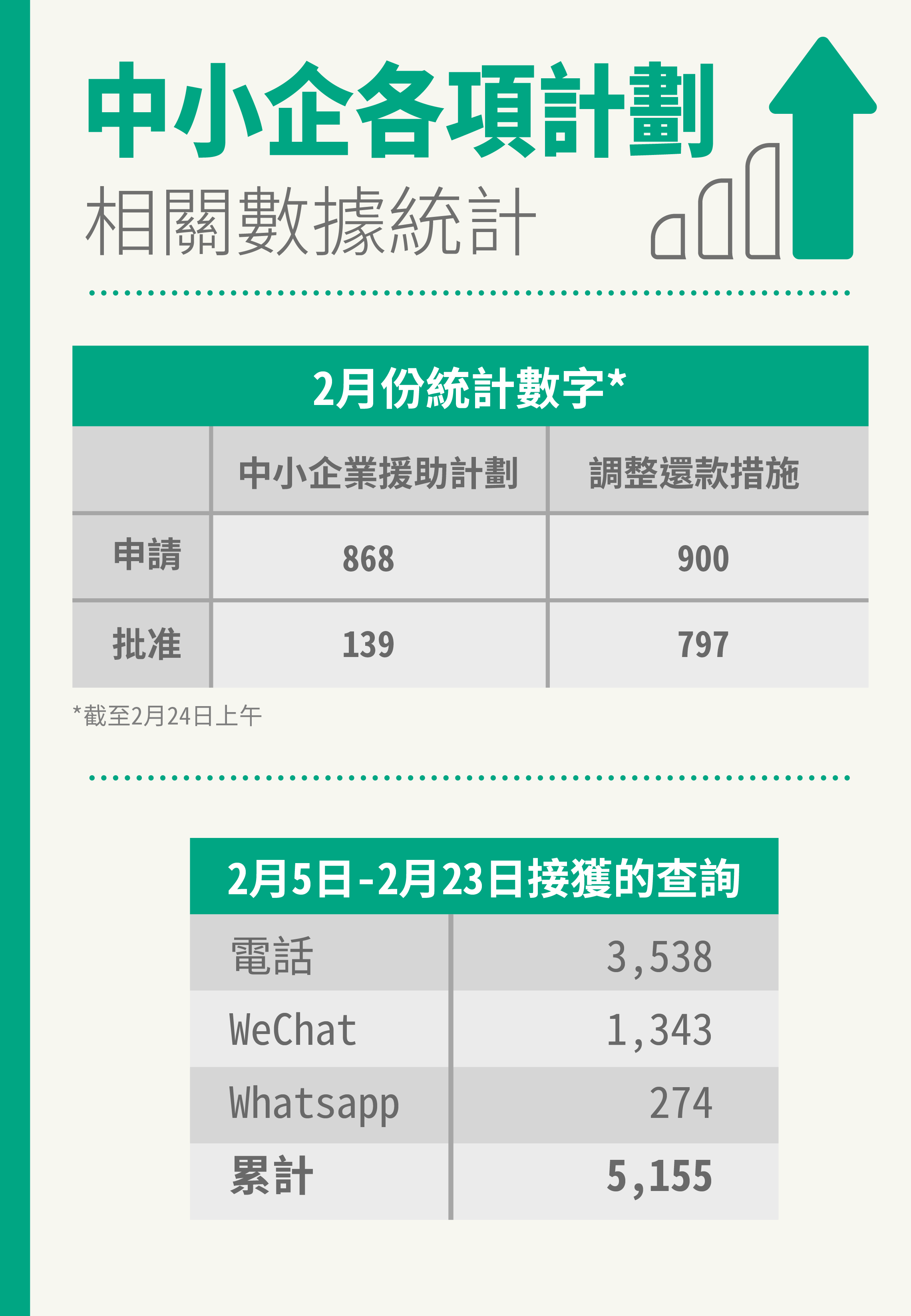 為方便企業主查詢計劃詳情,經濟局除加派人手接聽電話查詢(2888 2088)外,亦開通了微信服務號(“經濟局服務在線”/“DSEONLINE”),供市民辦公時間內進行線上查詢。由2月5日至2月23日,經濟局透過電話、微信及Whatsapp共收到5,155宗查詢。