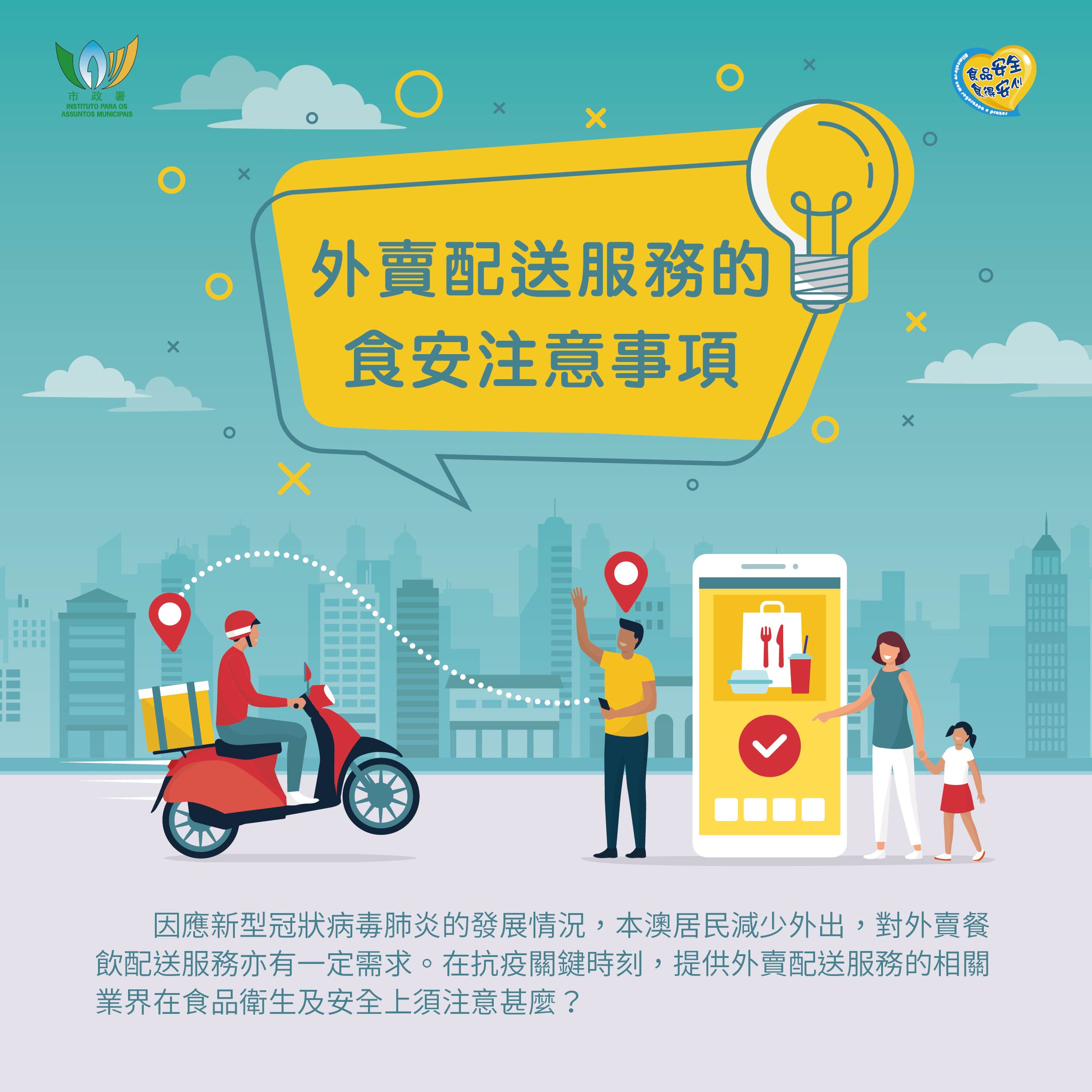 為提升本澳食品業界的食品安全與衛生意識,市政署持續派員走訪本澳食品生產經營場所,派發指引、小冊子及海報,指導商戶正確執行預防工作。亦製作了《外賣配送服務的食安注意事項》圖文包,提醒業界在提供外賣配送服務時,須注意的食品安全、個人及環境衛生,共同降低疾病在社區傳播的風險。