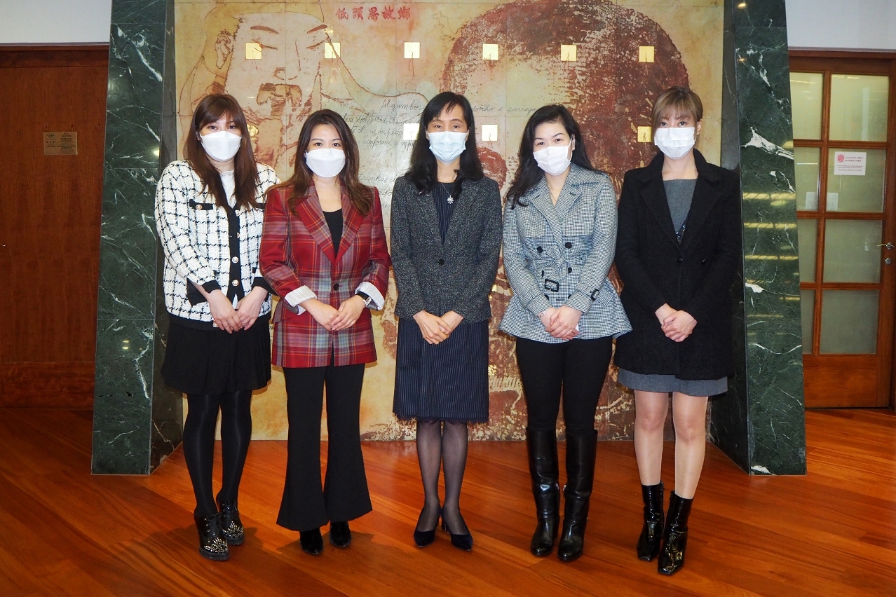 社會文化司司長歐陽瑜(中)與出席捐贈儀式的澳門海峽女企業家協會理事長杜翊瑗(左二)、監事長陳嘉麗(左一)、秘書長蔡亦晴(右一)、副會長周雙喜(右二)合影