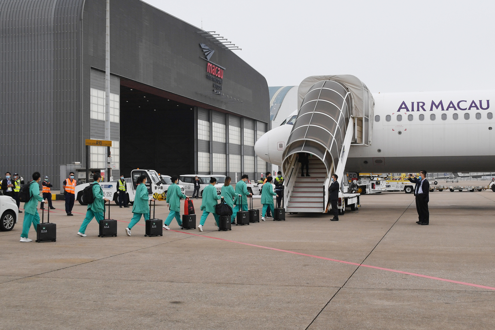 隨包機的工作人員,包括衛生局3名醫生、3名護士,旅遊局2名工作人員,以及7名機組人員於早上約7時先在仁伯爵綜合醫院集合並作準備工作,包括測量體溫以及最後檢查所需物資,其後一同前往澳門國際機場。行政法務司司長張永春、社會文化司司長歐陽瑜和行政長官辦公室主任許麗芳,早上前往機場並與隨包機的工作人員見面,為他們打氣。