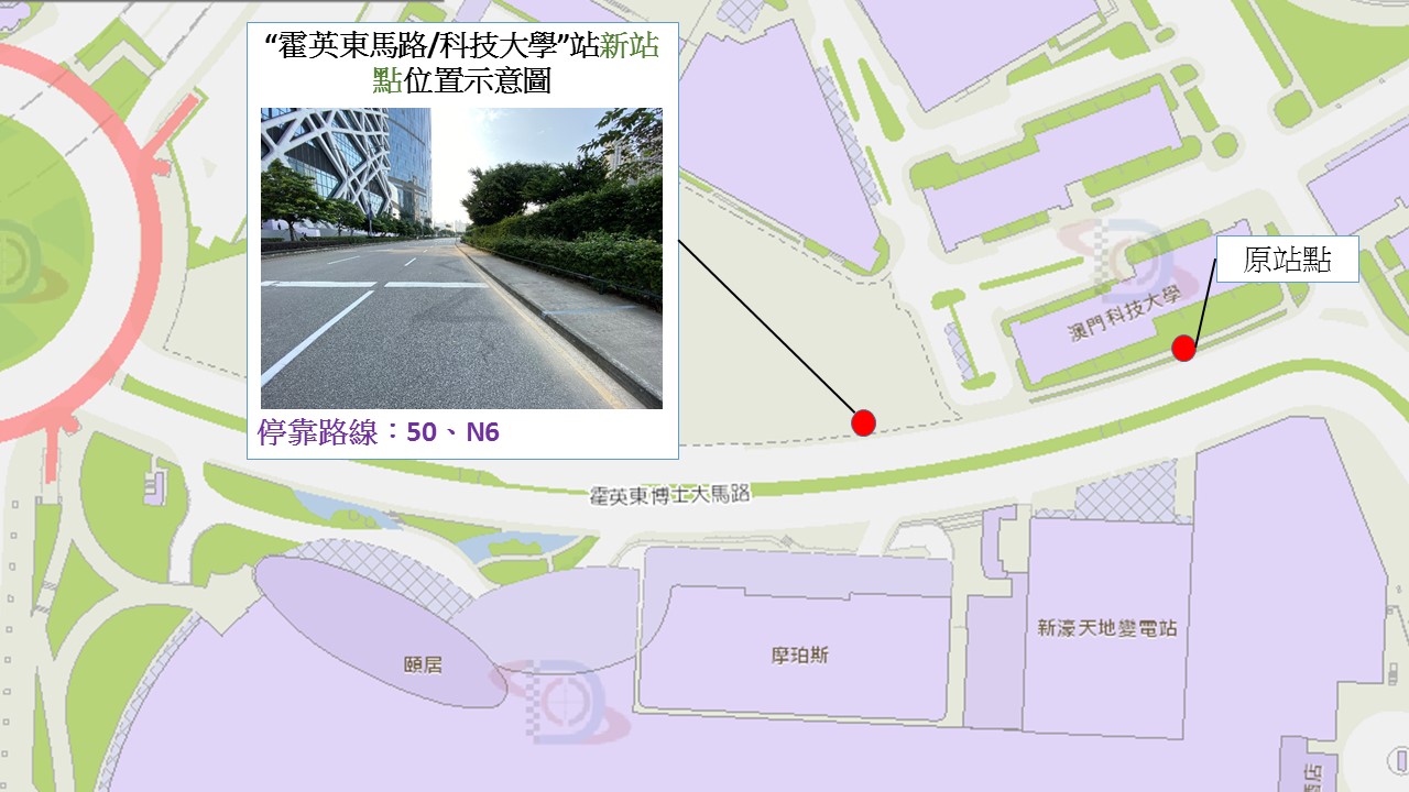 配合交通規劃,3月14日(周六)首班車起,“霍英東馬路/科技大學”巴士站將往路氹連貫公路圓形地方向永久遷移約120米,供乘搭50及N6巴士路線的乘客使用。交通事務局呼籲乘客留意。