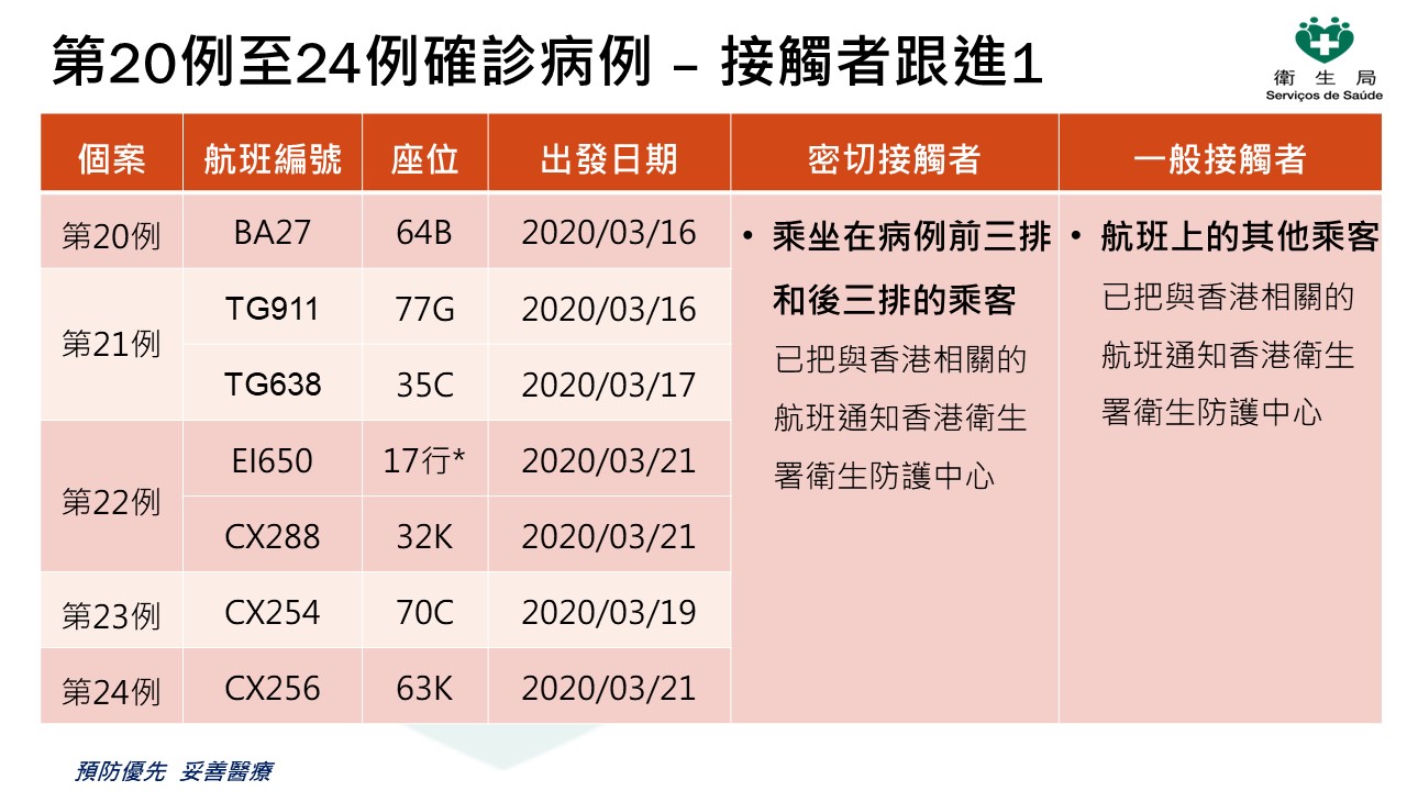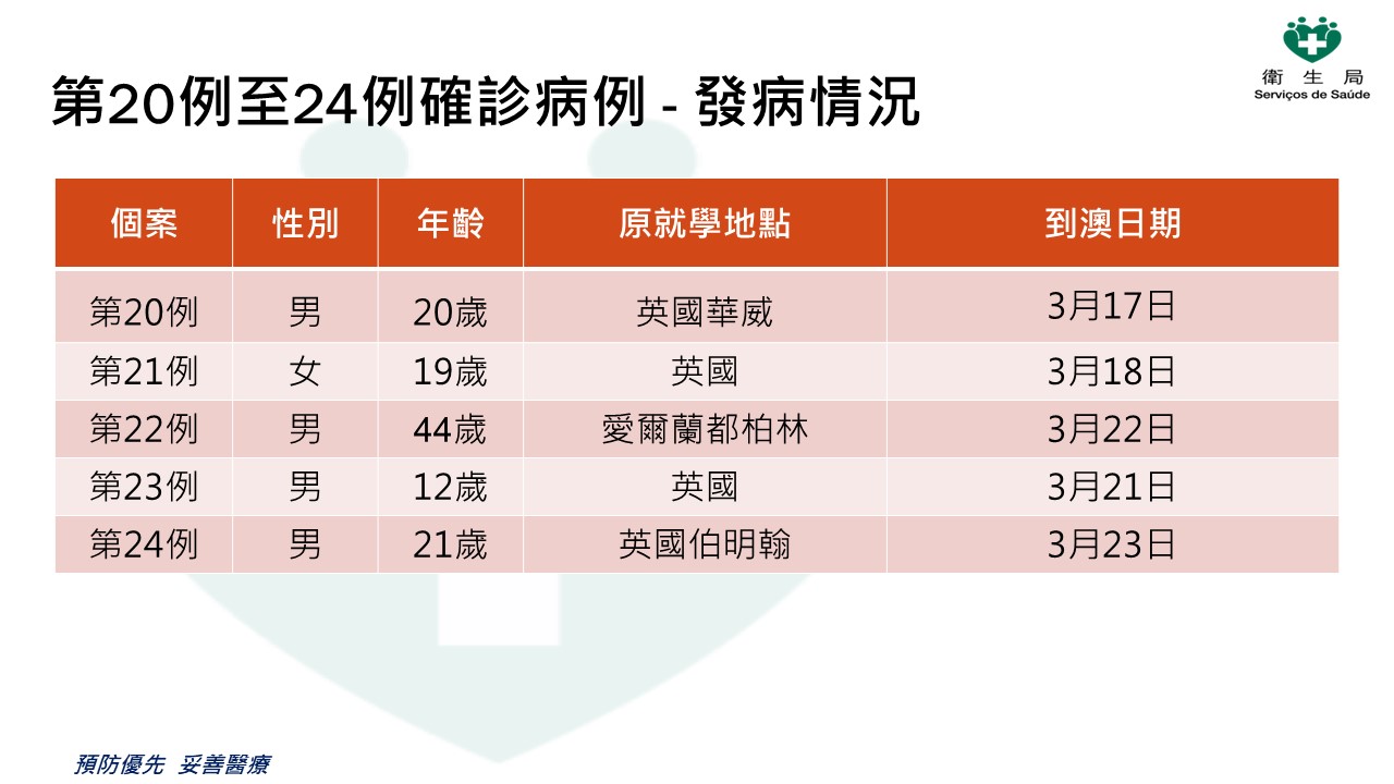新型冠狀病毒感染應變協調中心今(23)日表示,過去24小時本澳新增5例新型冠狀病毒肺炎確診病例,累計24例確診病例。