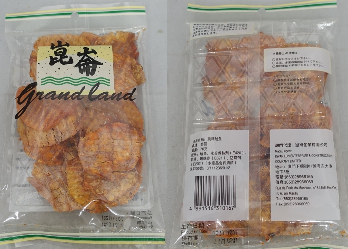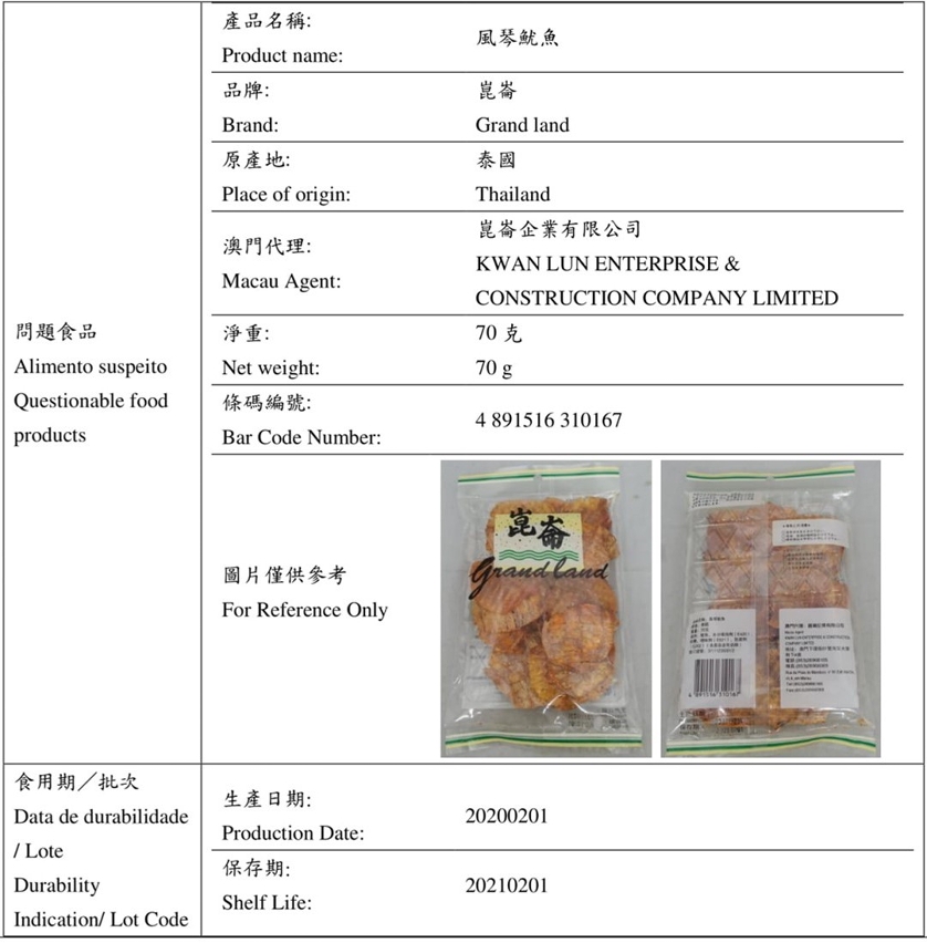 市政署恆常於本澳各零售點抽取食品樣本進行檢測,發現一款“崑崙”牌“風琴魷魚”的預包裝零食樣本含每公斤二千零七十毫克的防腐劑山梨酸,其含量超出本澳第7/2019號行政法規《食品中防腐劑及抗氧化劑使用標準》之規定。涉事產品的產地為泰國,淨重七十克,批次生產日期:2020 0201、保存期:2021 0201。市政署食品安全廳已即時採取跟進措施,勒令涉事商戶停售有關問題批次產品,並追溯產品的來源及銷售流向;同時,向本地食品供應及零售商發出食品預警;由於涉事產品經香港供應商所提供,市政署亦已通報香港食安部門知悉及跟進事件。