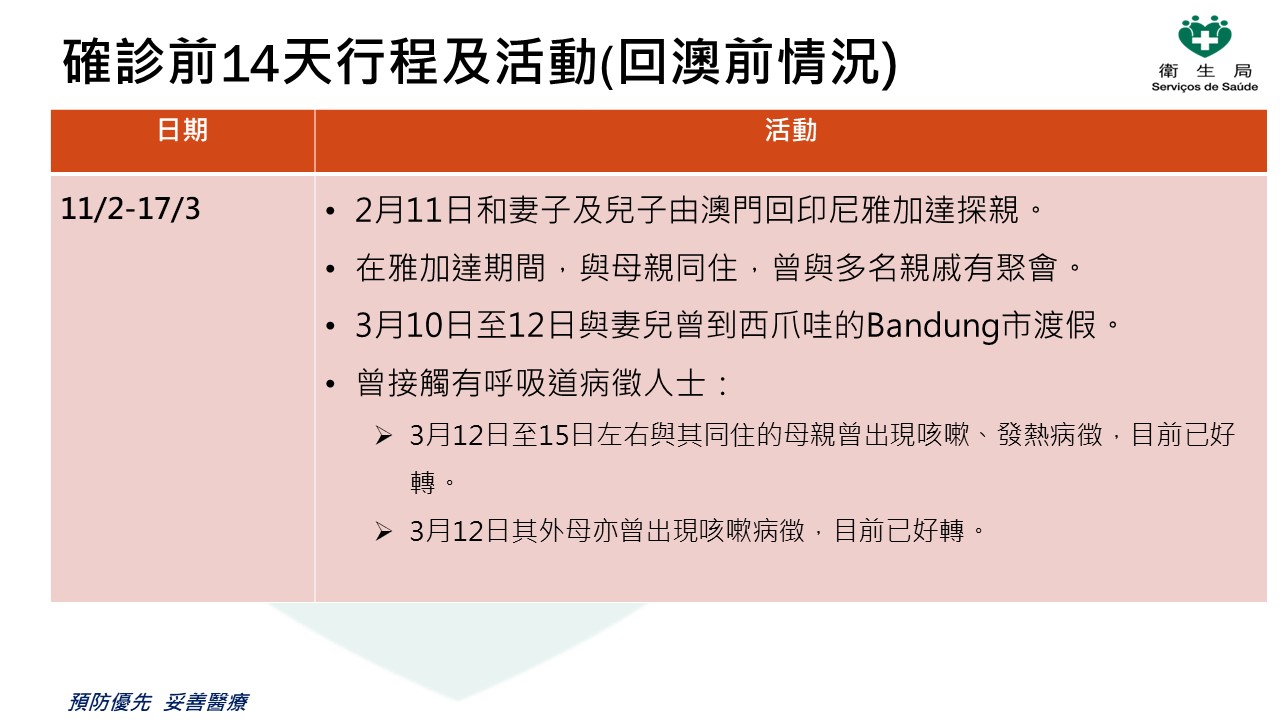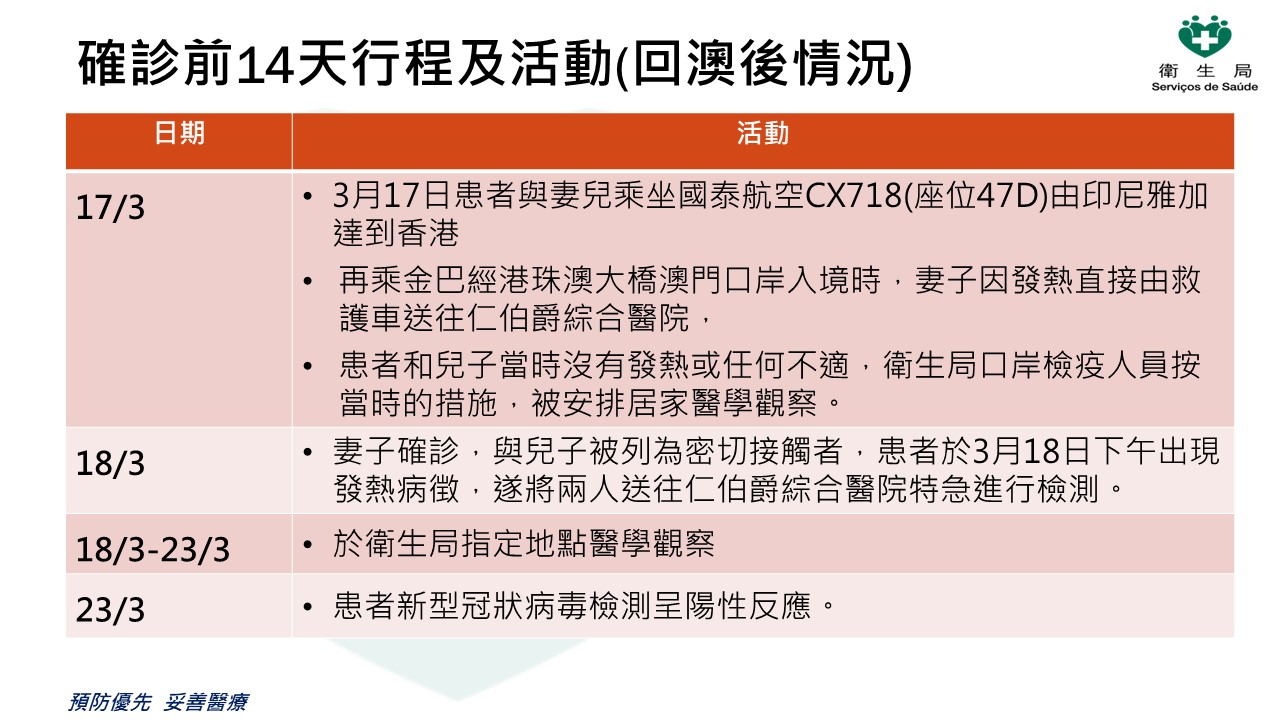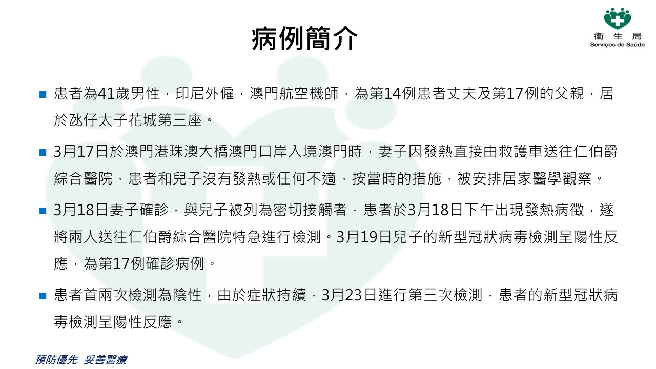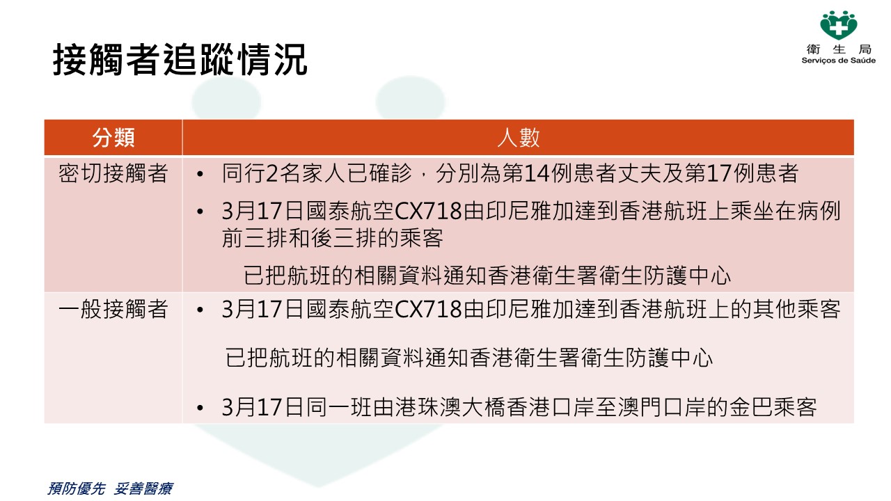 新型冠狀病毒感染應變協調中心表示,第25例患者乘坐的士由港珠澳大橋回到氹仔住所,期間患者及的士司機均有佩戴口罩,的士車窗亦有開啓。此外,當局已聯絡到相關司機,並將其列為一般接觸者,需要進行14日自我健康管理,當局亦會跟進其健康狀況。
