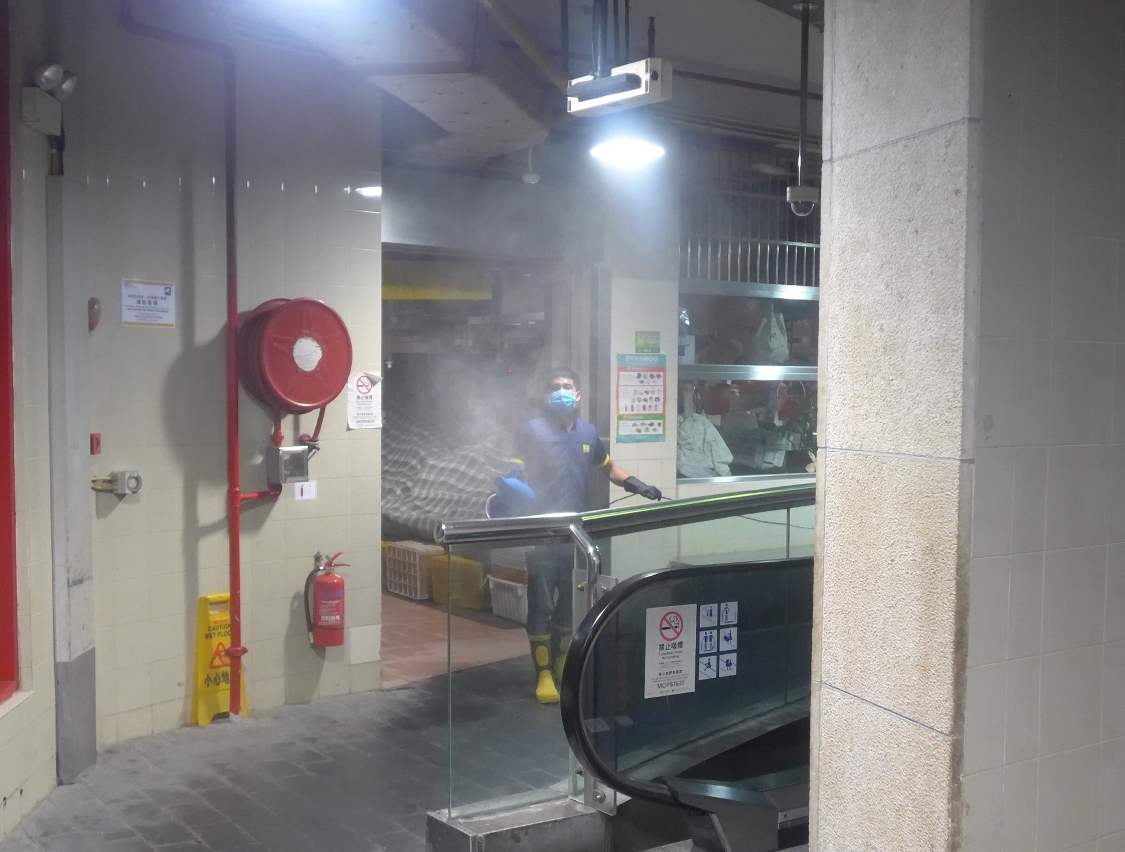 市政署於三月二十九日得悉有香港的新冠肺炎確診者曾到本澳並在營地街市購物,已馬上安排人員於當晚對營地街市進行大型清潔和消毒工作,並以熱水壓力機清洗街市門前地方、升降機及扶手電梯、消防梯間的扶手、熟食中心的枱及椅子等,以及使用煙霧式消毒設備進行消毒。