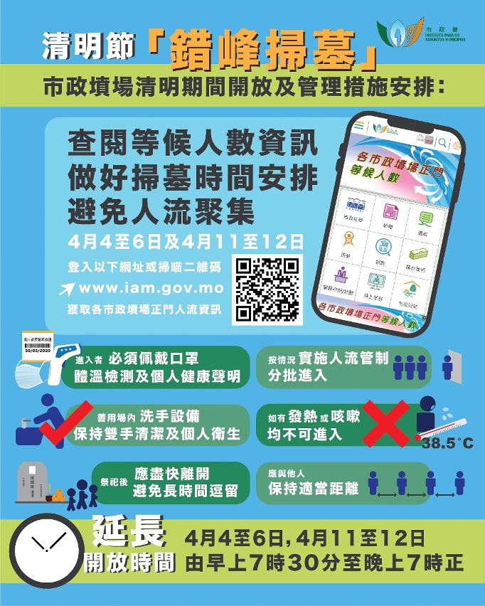 市政署轄下市政墳場於四月四日至六日、四月十一日至十二日延長開放時間,由早上七時三十分至晚上七時正開放,而為讓市民瞭解各市政墳場正門的人流情況,市政署於上述期間將透過網站http://www.iam.gov.mo向市民發佈相關資訊,屆時市民可登入上述網站或掃瞄有關二維碼(QRCode)進入查閱。此外,按過往情況,於清明節正日市民多集中於早上九時至下午三時期間前往掃墓,市政署建議市民應錯峰及參閱網站等候人數資料,以作更好掃幕安排,減低人流聚集的風險。