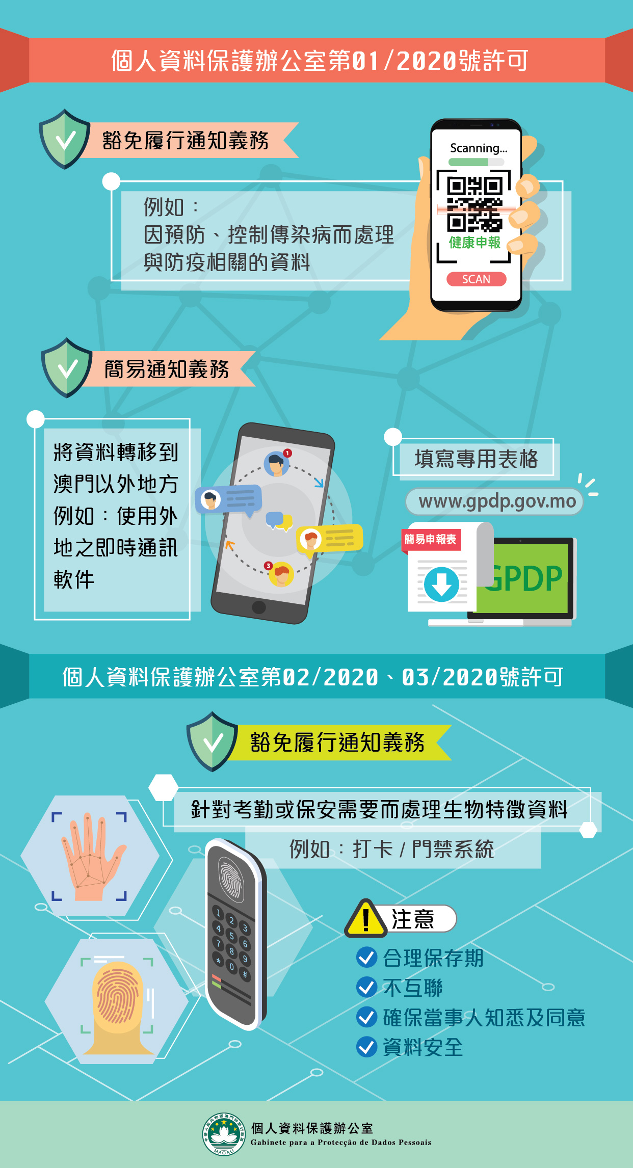 個資辦考慮到上述疫情防控工作的廣泛性及基於便捷、經濟和有效原則,特發出第01/2020號“為執行預防和控制傳染病的措施而收集與處理進出場所人士的個人資料”的豁免及以簡化方式履行通知的義務許可,並追溯至二零二零年一月一日生效。