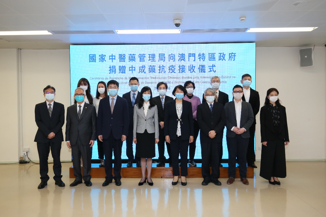國家中醫藥管理局透過澳門紅十字會協助運送1,500盒“金花清感顆粒”、1,000盒“藿香正氣軟膠囊”、3,500盒“疏風解毒膠囊”,透過冠華行協助運送800盒“連花清瘟膠囊”至澳門,合共捐贈6,800盒中成藥。連花清瘟膠囊、金花清感顆粒、疏風解毒膠囊和藿香正氣軟膠囊四款中成藥已獲國家藥品監督管理局批准註冊,並被納入國家“新型冠狀病毒肺炎診療方案”,主要用於醫學觀察期且出現乏力伴胃腸不適或伴發熱的病人的症狀改善,在國內的疫情防控中,上述中成藥已被證實具有緩解症狀及減輕病症發展的效用。倘有需要,衛生局的中醫生會為相關病人開處上述中成藥。
