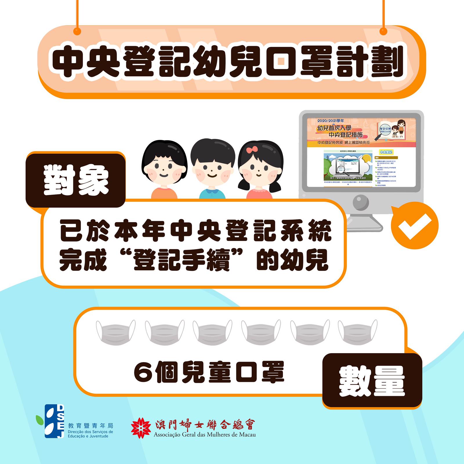 為關顧首次入學幼兒於5月2日起入學面談的需要及配合招生工作的開展,在衛生局的協助下,教青局將向中央登記約6,400名幼兒派發6個兒童口罩,並與澳門婦女聯合總會合作,透過其位於各區的5個領取點讓入學面談幼兒家長領取口罩。