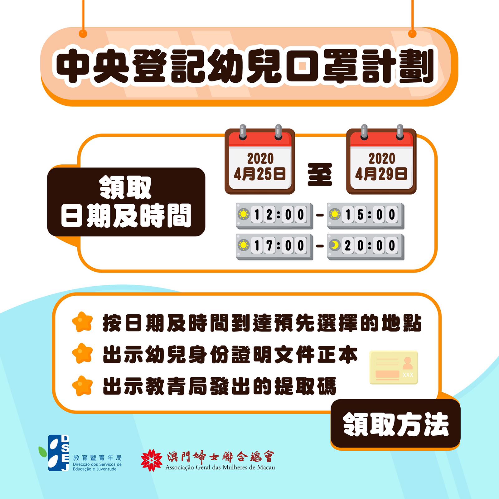 已於本年中央登記系統完成 “登記手續” 的幼兒家長可於4月21日10點至4月22日23點59分期間,登入教青局網頁輸入幼兒身份證號碼及中央登記驗證碼,選擇領取口罩的時間及地點,確認及提交後,已登記的手機號碼於24小時內收到教青局發出的短訊。其後,家長按日期及時間到達預先選擇的地點,出示幼兒身份證明文件正本及教青局發出的提取碼,便可領取兒童口罩。