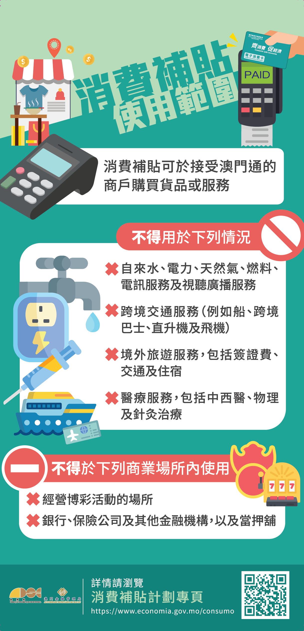 消費卡每日使用上限為300元,且不得兌換為現金,亦不得用於繳付自來水、電力、天然氣、燃料、電訊服務及視聽廣播服務費用,亦不得用於博彩場所、境外旅遊服務、跨境交通服務、醫療服務、金融機構等法規訂定的特定場所或用途。