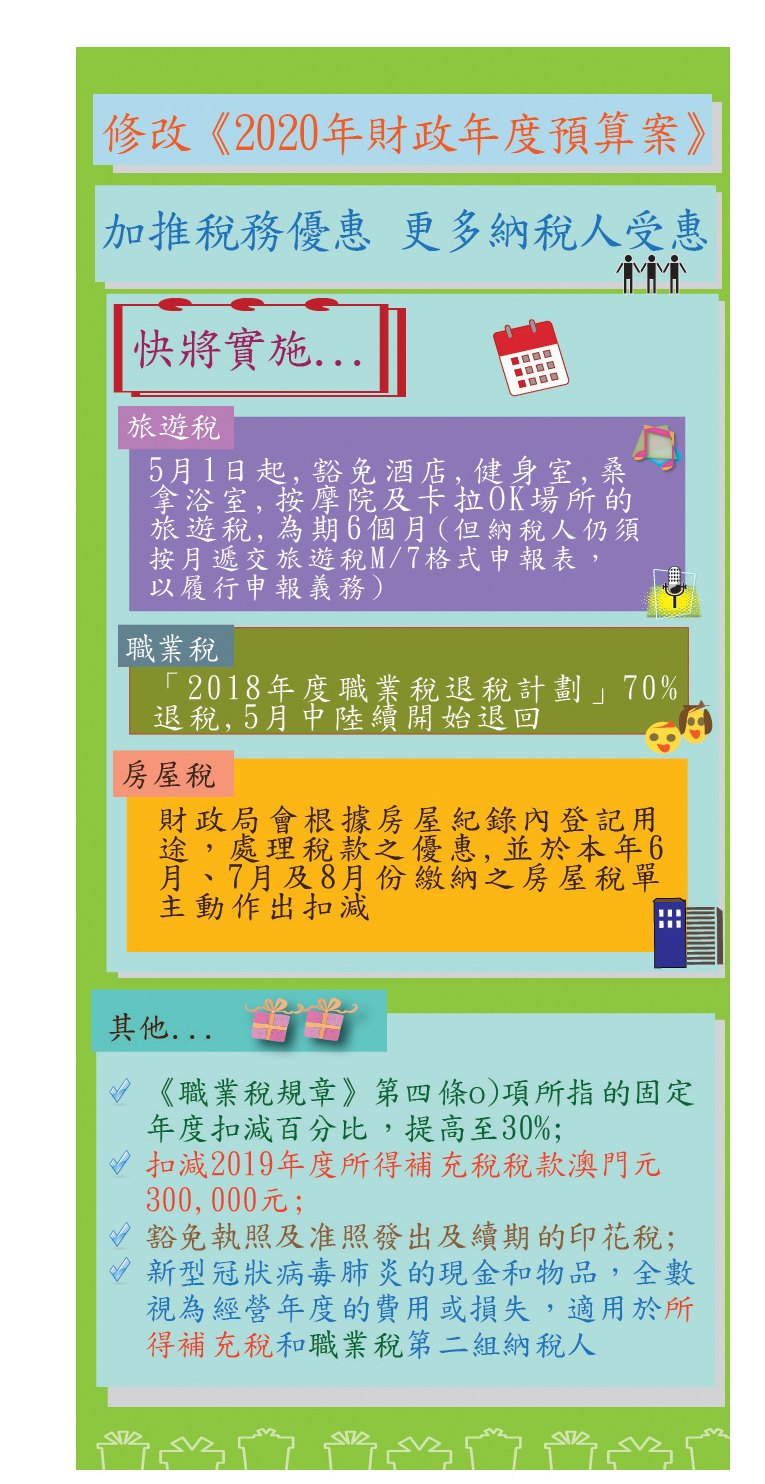 根據第3/2020號法律修改《2020年財政年度預算案》,於原預算案之稅務優惠基礎上,增加多項優惠措施,涵蓋稅項包括:職業稅、所得補充稅、房屋稅、印花稅及旅遊稅,當中涉及財政局執行之職業稅退稅、旅遊稅及房屋稅之優惠快將實施。