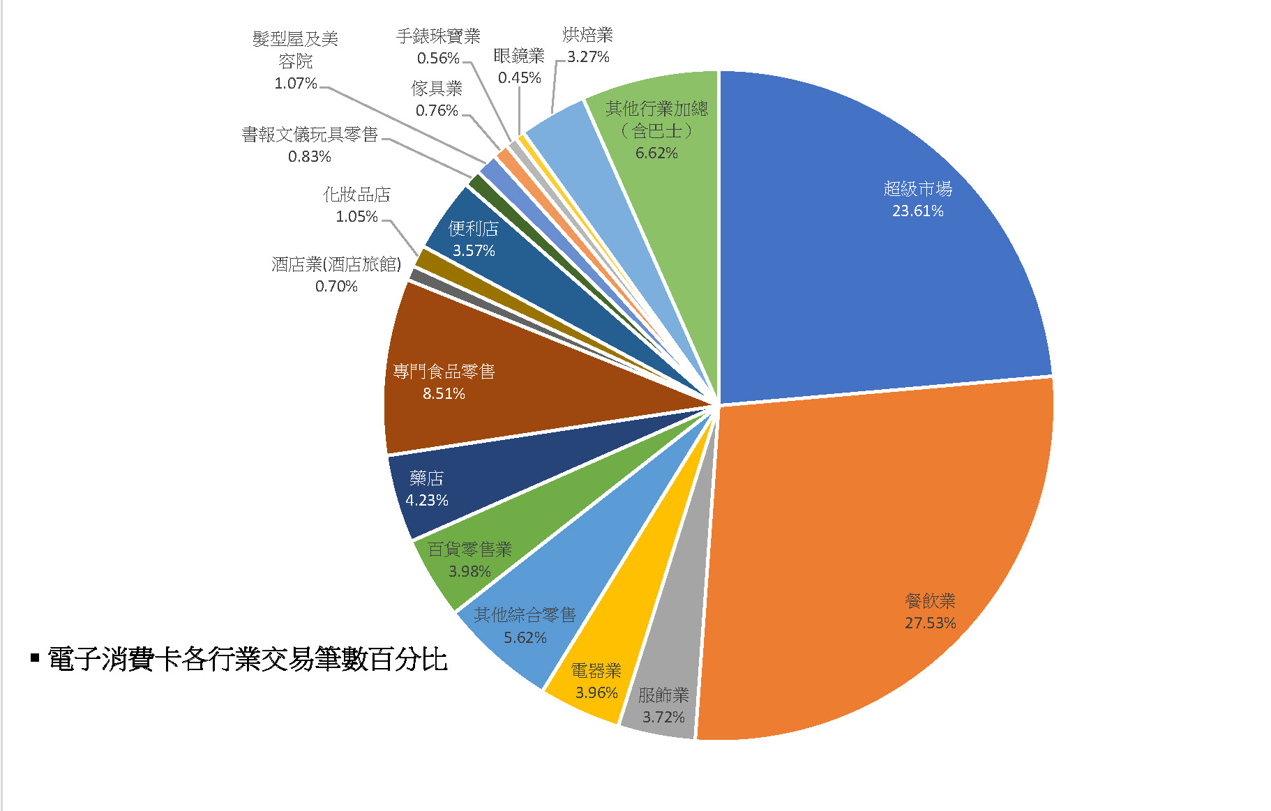 按交易筆數計算,頭五位的行業包括飲食業、超市業、專門食品業、中小型百貨零售業、藥店,分別是27.53%、23.61%、8.51%、5.62%、4.23%。按交易金額計算,交易頭五位的行業包括超市業、飲食業、電器業、中小型百貨零售業、服飾業,佔比分別是22.03%、21.44%、8.90%、7.68%、6.72%。