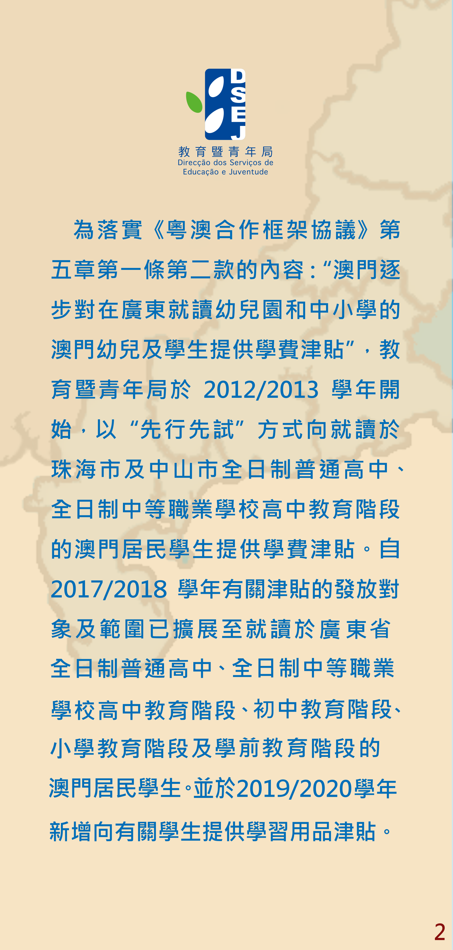 為落實《粵澳合作框架協議》中,有關澳門逐步對在廣東省就讀幼兒園和中小學的澳門幼兒及學生提供學費津貼的內容,特區政府於2012/2013學校年度開始以“先行先試”方式向就讀於珠海市及中山市全日制普通高中、全日制中等職業學校高中教育階段的屬澳門特別行政區居民的學生提供學費津貼,至2017/2018學校年度已擴展至就讀於全廣東省21個市的學前教育、小學教育、初中教育、全日制普通高中及全日制中等職業學校高中教育階段的屬澳門特別行政區居民的學生。考慮到有關學生須支出購買文具、學習用品、參考書籍及練習課本等費用,特區政府於2019/2020學校年度除繼續向有關學生發放“學費津貼”外,新增發放“學習用品津貼”。