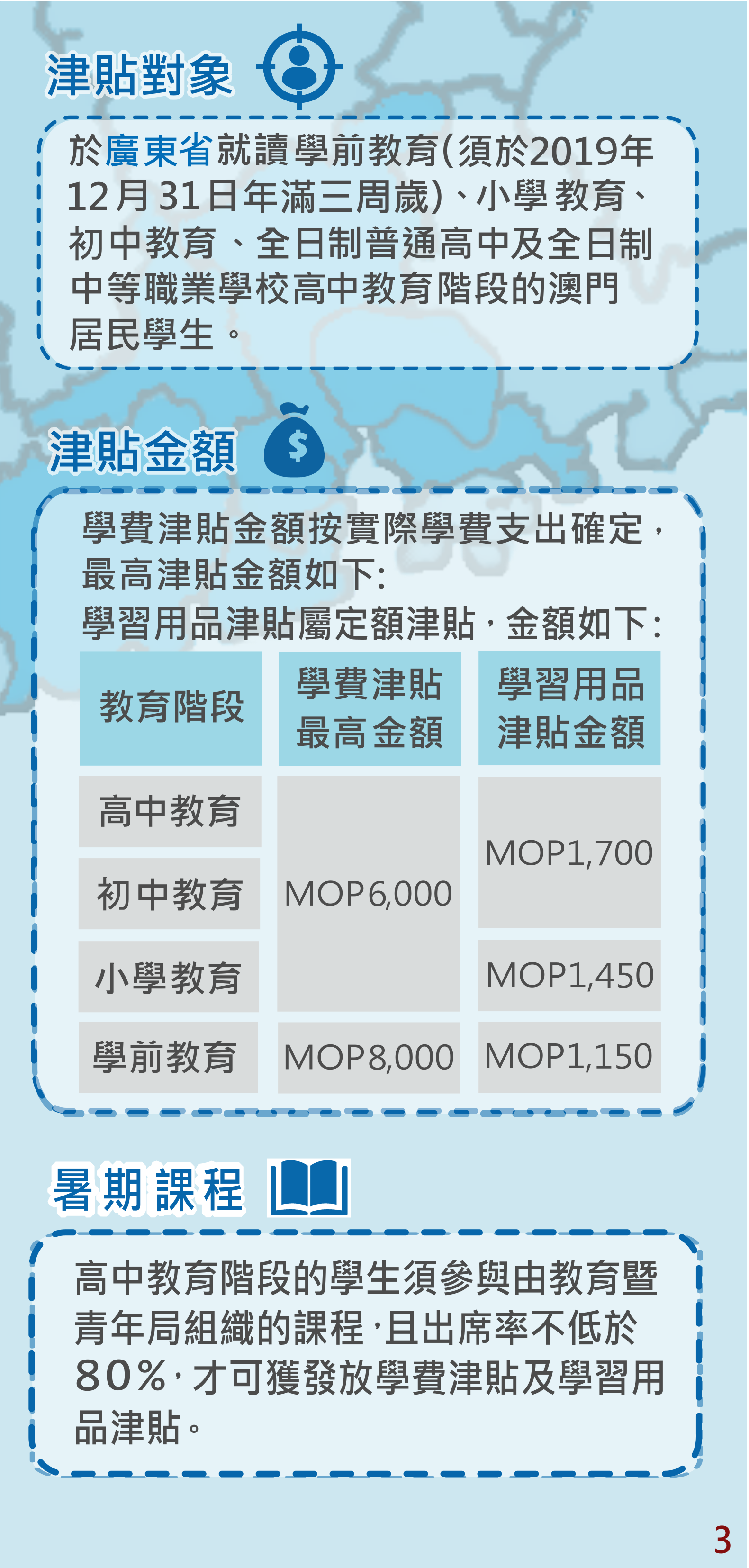 法規規定凡就讀高中教育的有關學生,須於二零二零年六月至八月期間,參與由教育暨青年局組織的、旨在加強對澳門政治、經濟及文化等方面認識的課程,其課時不少於十二小時且學生出席率不得低於百分之八十,方可獲發放津貼。