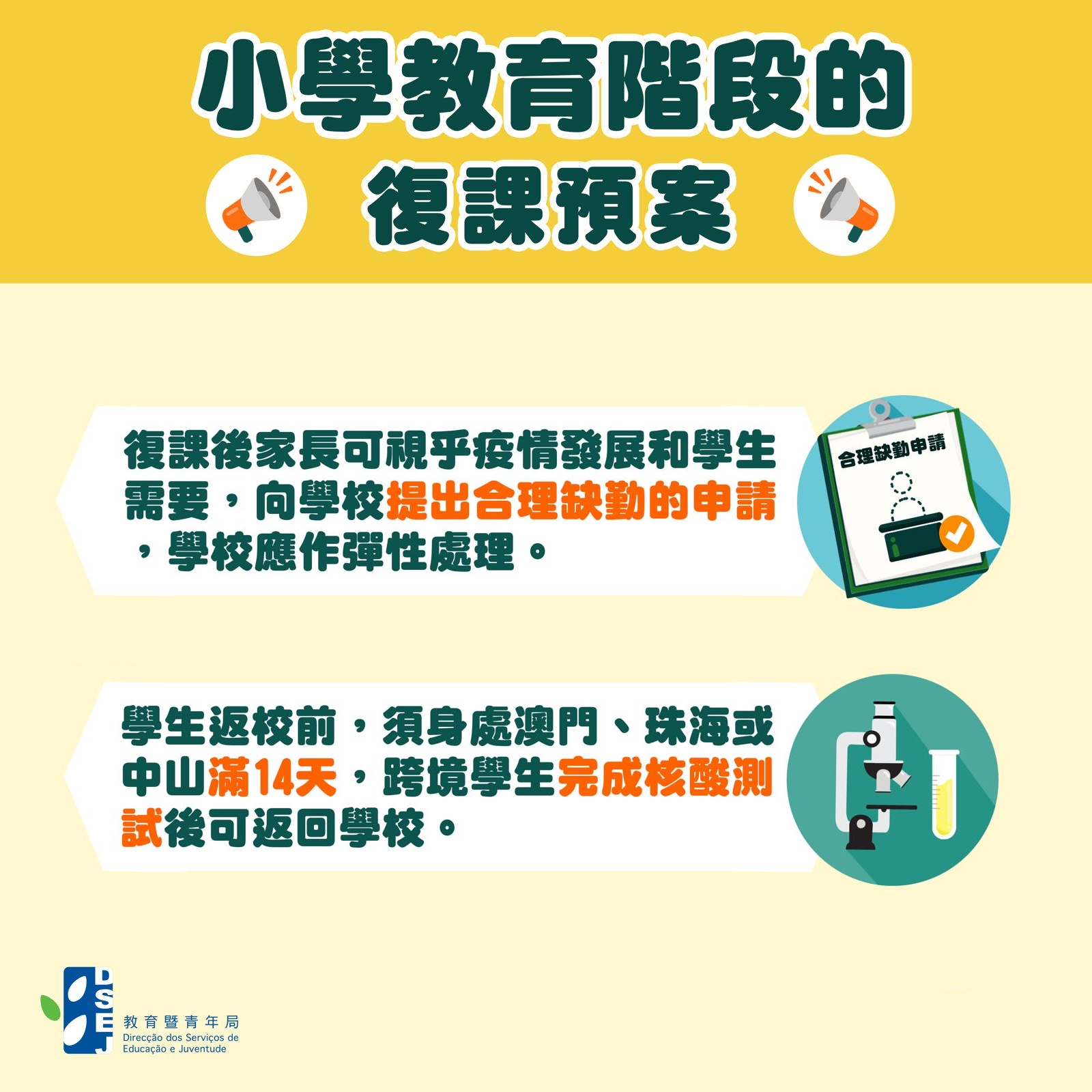 在諮詢衛生部門,並聽取其專業意見,以及與教育界代表進行深入和實務的探討後,教育暨青年局擬定了小學教育的復課安排,將分兩個階段按序復課。幼兒教育及特殊教育的復課安排,會考慮以更彈性的方式處理,或不排除本學年不回校上課,並繼續進行在家學習的方案。