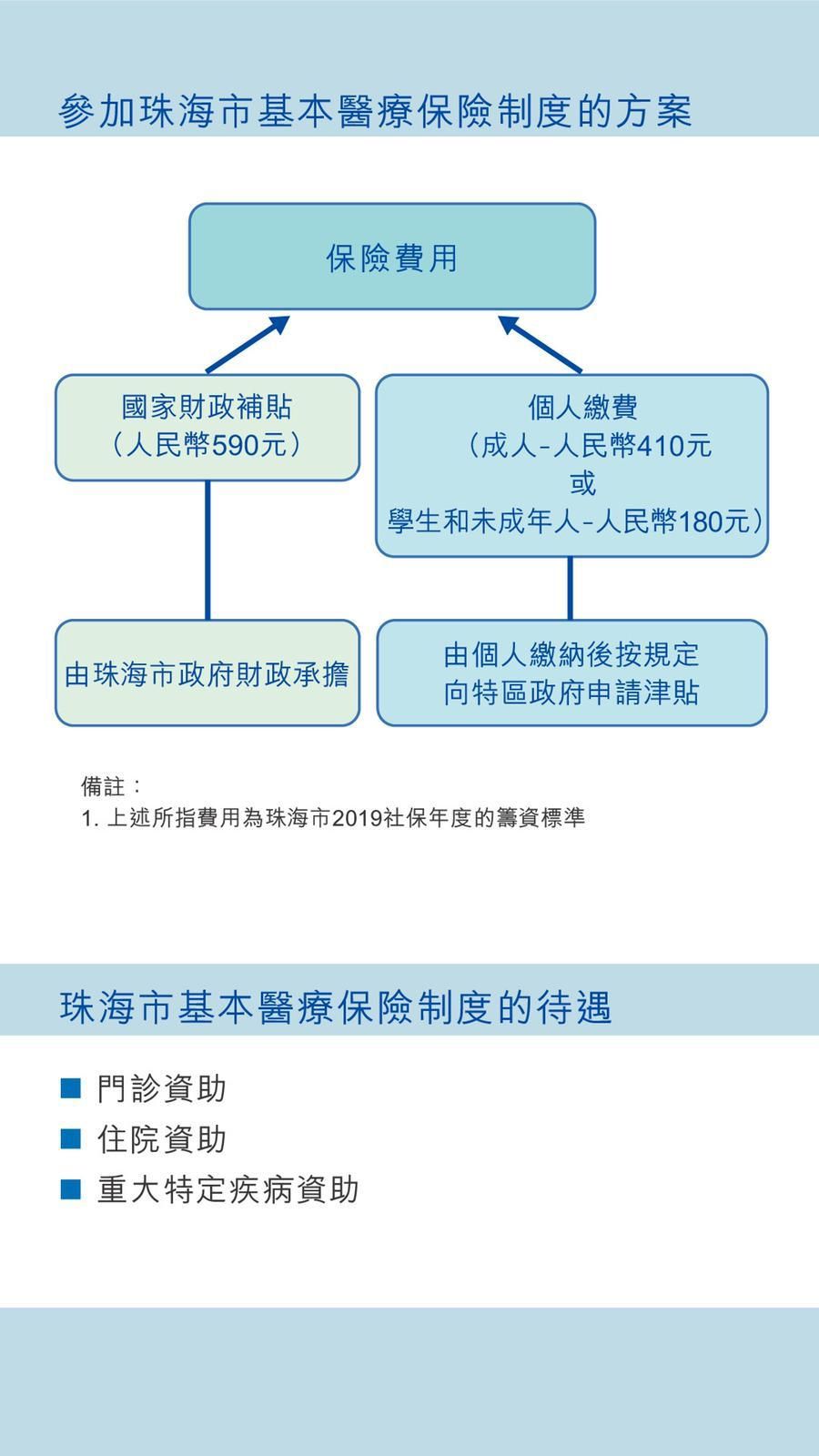 由於國家政策擴展,容許居住於內地的港澳台居民參加當地的醫療保險,珠海市於2020年1月1日起接受居住於市內的澳門居民參加珠海市基本醫療保險計劃,計劃所需費用中的財政補貼部分由珠海市政府承擔,餘下個人繳費部分由個人繳納。為協助澳門居民無障礙加入內地基本醫療保險制度,向合資格居民提供津貼,以補貼其個人繳納的費用,特區政府制定了《居住於內地的澳門特別行政區居民醫療保險津貼計劃》行政法規。