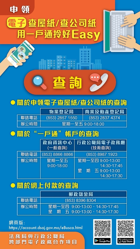 是次擴大網上申領電子書面報告的服務對象,是法務局與行政公職局電子政務跨部門的合作項目,主要目的是方便市民,讓市民無需外出亦能申領。凡已開立行政公職局「一戶通」的市民,可透過“一戶通” 的網頁版或手機應用程式,又或法務局的專屬網頁 ( https://account.dsaj.gov.mo/eBusca.html ) 來申請電子版的物業登記書面報告及商業登記書面報告,申請完成後隨即進行網上付款,市民可使用“VISA信用卡”、“MASTERCARD信用卡”、“中銀e網”或“銀聯在線支付”等方式支付,便即可獲取電子版“查屋紙”或“查公司紙”。