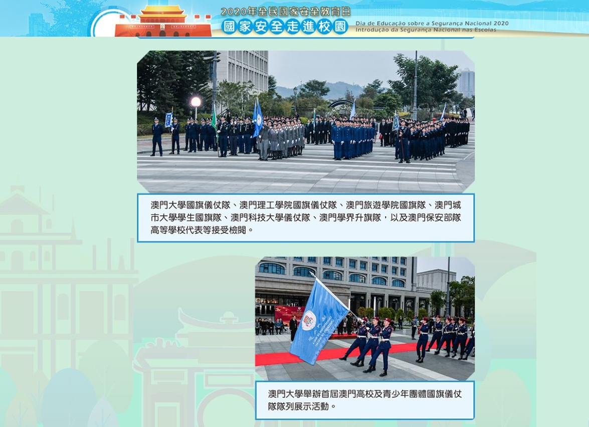 為響應澳門特區政府推廣全民國家安全教育,澳門大學於4月中起組織超過2400名研究生、文化藝術校隊和國旗儀仗隊成員,透過網絡觀看和推廣特區政府舉辦的2020年全民國家安全教育日——“國家安全走進校園”網絡圖片展,加深對國家安全文化的認識。