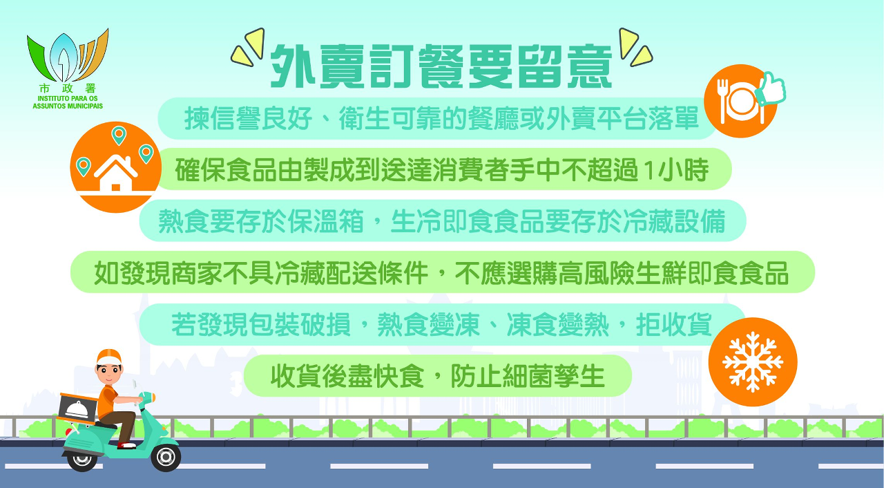 市政署已於食品安全資訊網www.foodsafety.gov.mo設置了「夏日食品安全」專頁及「【精明消費】外賣訂餐要注意」專頁,歡迎市民及業界登入網站瀏覽,獲取更多食安資訊。