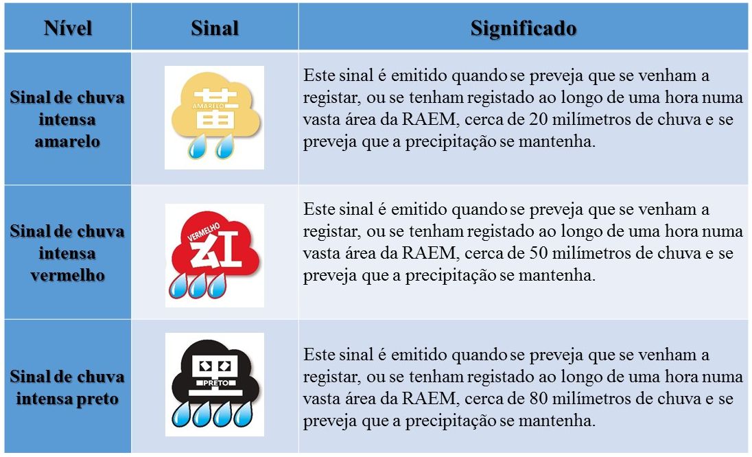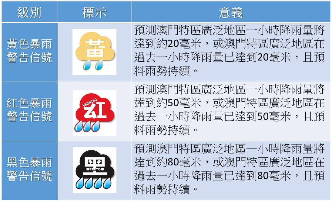 新修訂的《暴雨警告信號系統》於2020年6月1日經由第17/2020號行政命令核准,並將於9月1日起正式生效。新的《暴雨警告信號系統》分為三個級別,以反映不同強度的暴雨所帶來的風險和影響,讓社會上不同群體因應自身的條件和需求,採取適當的應變措施。此外,是次修改亦同時對《雷暴警告信號》的安全提示進行優化。