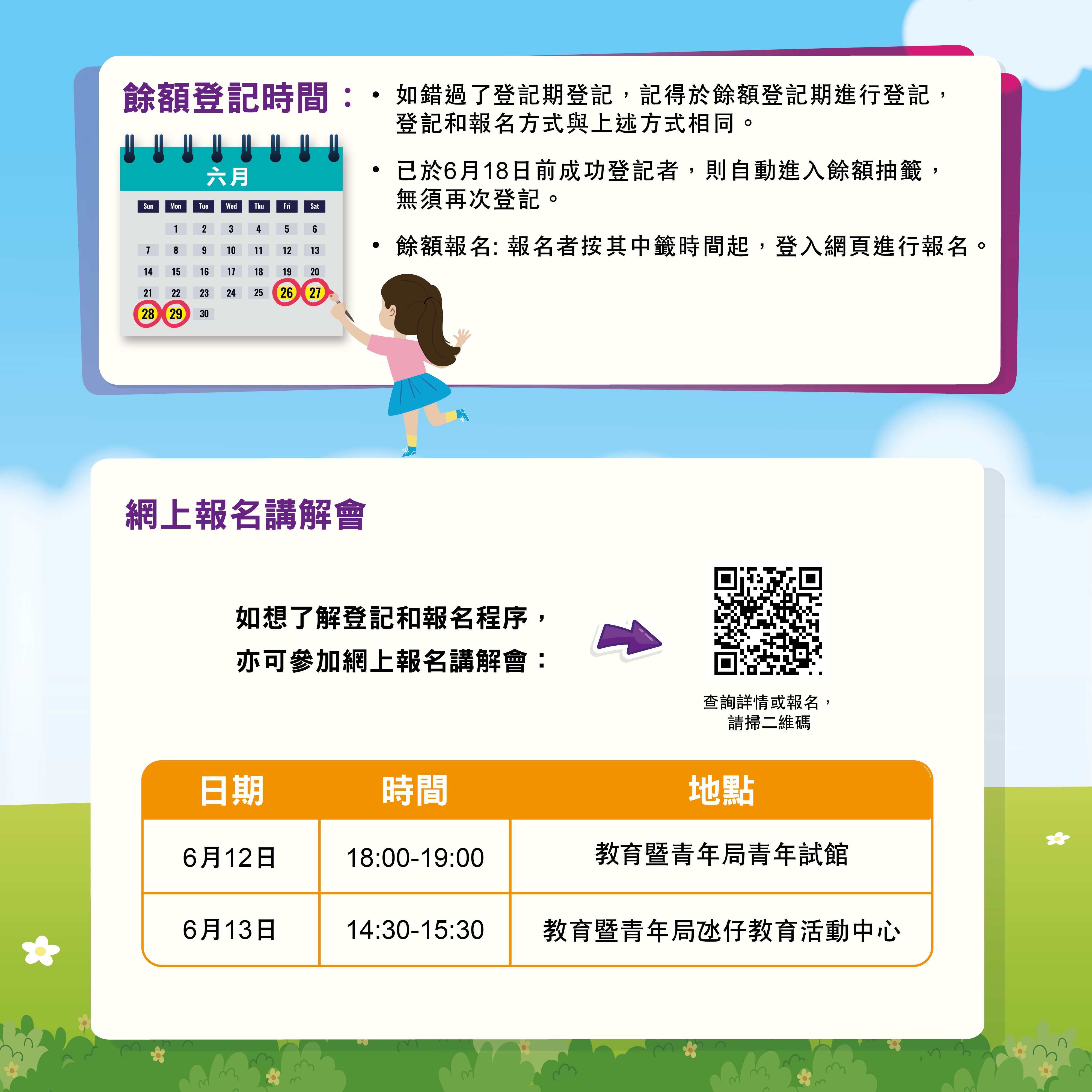 爲了讓市民瞭解網上報名流程,主辦單位將分別於6月12日在青年試館及6月13日在氹仔教育活動中心舉辦網上報名講解會(講解會報名連結www.summeractivity.gov.mo/sasmember/signup)。