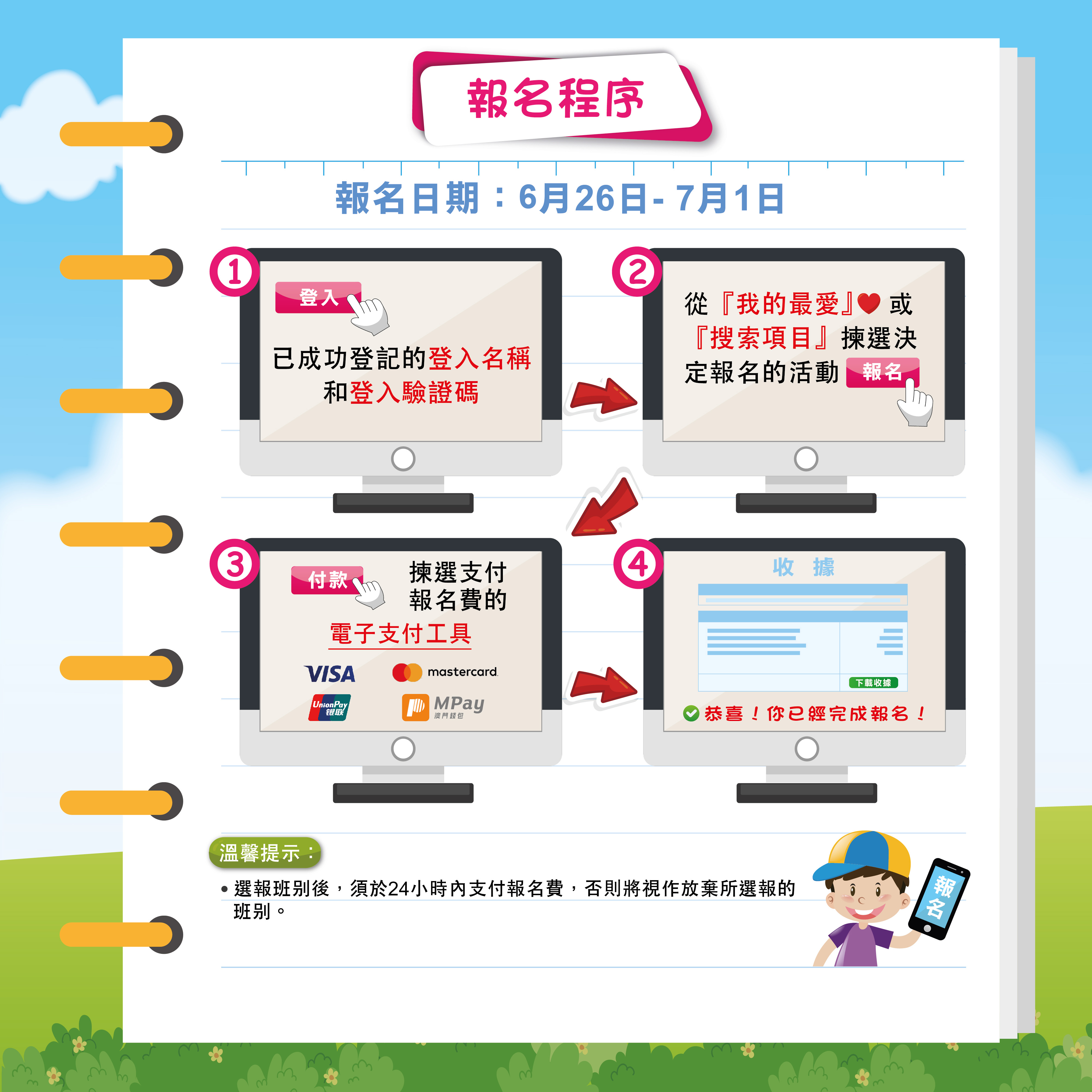教育暨青年局與體育局主辦的2020暑期活動全面網上報名,登記日期爲6月12日上午10時至6月18日晚上10時,參加者可登入暑期活動網頁www.summeractivity.gov.mo進行登記。成功登記者須於6月23日公布抽籤結果後,按中籤時間完成網上報名,並以電子支付方式繳費。報名採用先到先得形式進行。