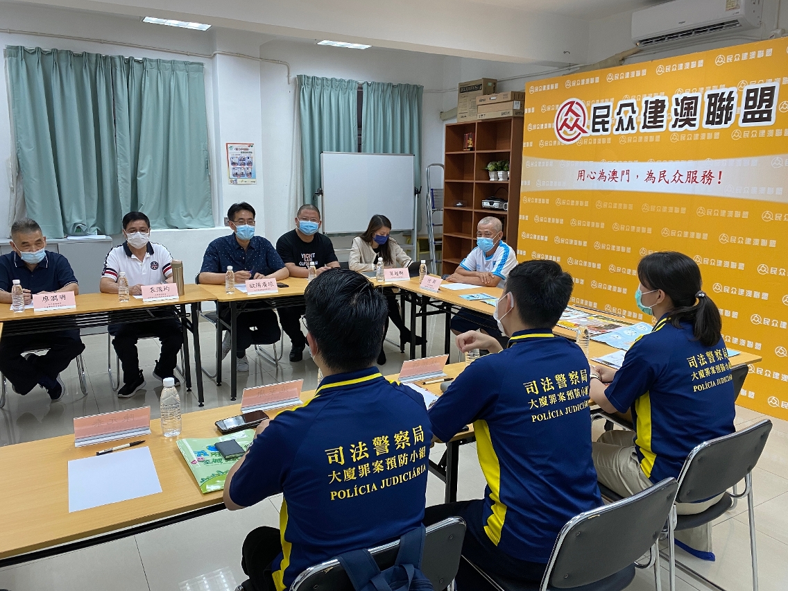 因應本澳新型冠狀病毒肺炎疫情緩和,市面人流增多,為瞭解社區最新的治安資訊,司法警察局大廈罪案預防小組於5月下旬起分別與澳門物業管理業商會、澳門不動產管理專業技術人員協會、澳門物業管理專業人員協會、澳門街坊會聯合總會、澳門工會聯合總會、澳門婦女聯合總會、澳門歸僑總會及民眾建澳聯盟等已加入“司警局大廈防罪之友”的社團會員代表會面交流,冀能團結力量,築牢社區網絡,防範罪案發生。