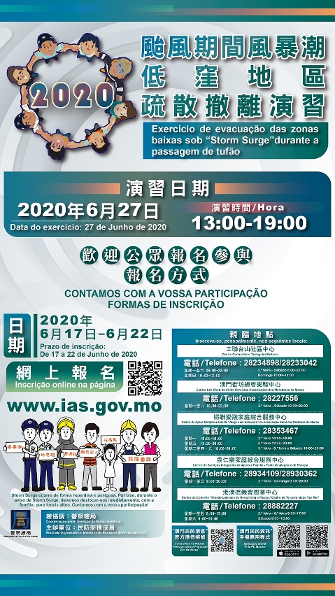 演習報名日期由6月17日早上10時起至22日晚上12時,市民可到社工局網頁 www.ias.gov.mo 報名,或到工聯台山社區中心、澳門街坊總會樂駿中心、婦聯樂融家庭綜合服務中心、泉仁樂家庭綜合服務中心、港澳信義會恩耆中心報名,歡迎市民踴躍參加,與民防架構成員攜手做好本年度風季的預防工作。