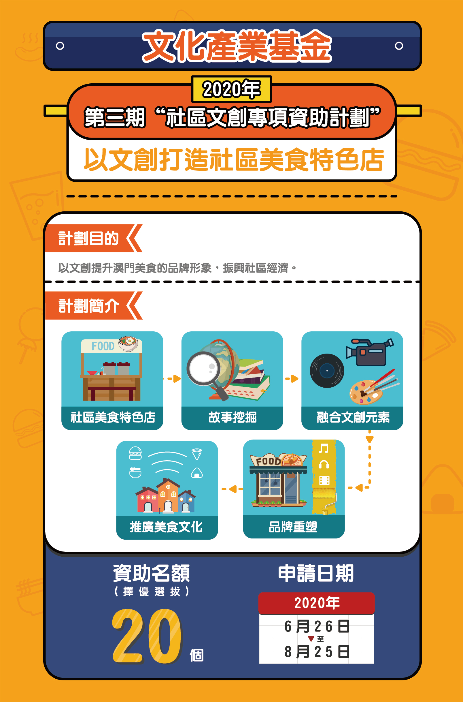 文化產業基金於6月26日至8月25日接受第三期“社區文創專項資助計劃”申請,對象為社區美食特色店。